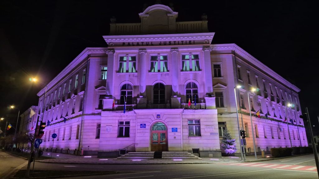 Palatul Justiției locație în care funcționează Curtea de Apel Alba Iulia, dar și Prefectura Județului Alba, era iluminat, dar în mov.