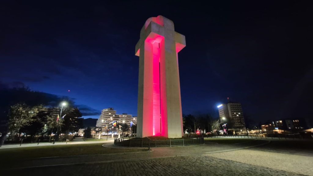 Monumentul Unirii din parcul Unirii din Alba Iulia era iluminat în roșu, în jurul orei 18.30