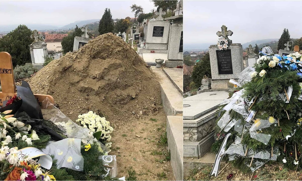 Mai mult de atât, femeia a postat și câteva poze în care se poate observa cum un morman de pământ este lăsat în mijlocul drumului sau cum groparii au strâns mai multe coroane de flori chiar lângă un alt loc de veci.