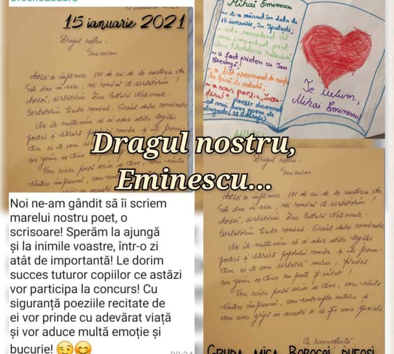 Astfel, ei au confecționat cadouri inedite pentru marele nostru poet, exersând tehnici specifice activităților artistico-plastice și practice (inimioare, peisaje, felicitări, lucrări deosebite etc.), au transmis urări și mesaje frumoase și au interpretat fragmente muzicale inspirate din versuri eminesciene.