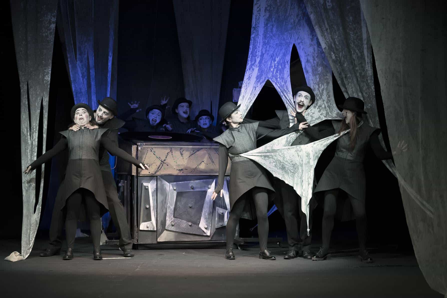 Descinși, parcă, dintr-un film mut (a la Buster Keaton; acompaniați, de muzica potrivită) actorii apar în fața spectatorilor drept niște personaje, evident mute, care nu pot decât să mimeze că urmează să se întâmple ceva. Ceva care poate să fie comic, amuzant, ceva care poate să fie înfricoșător, ceva... În același timp, discreți, pe tot parcursul, schimbă decorul, interpreteză, sunt parte din poveste.