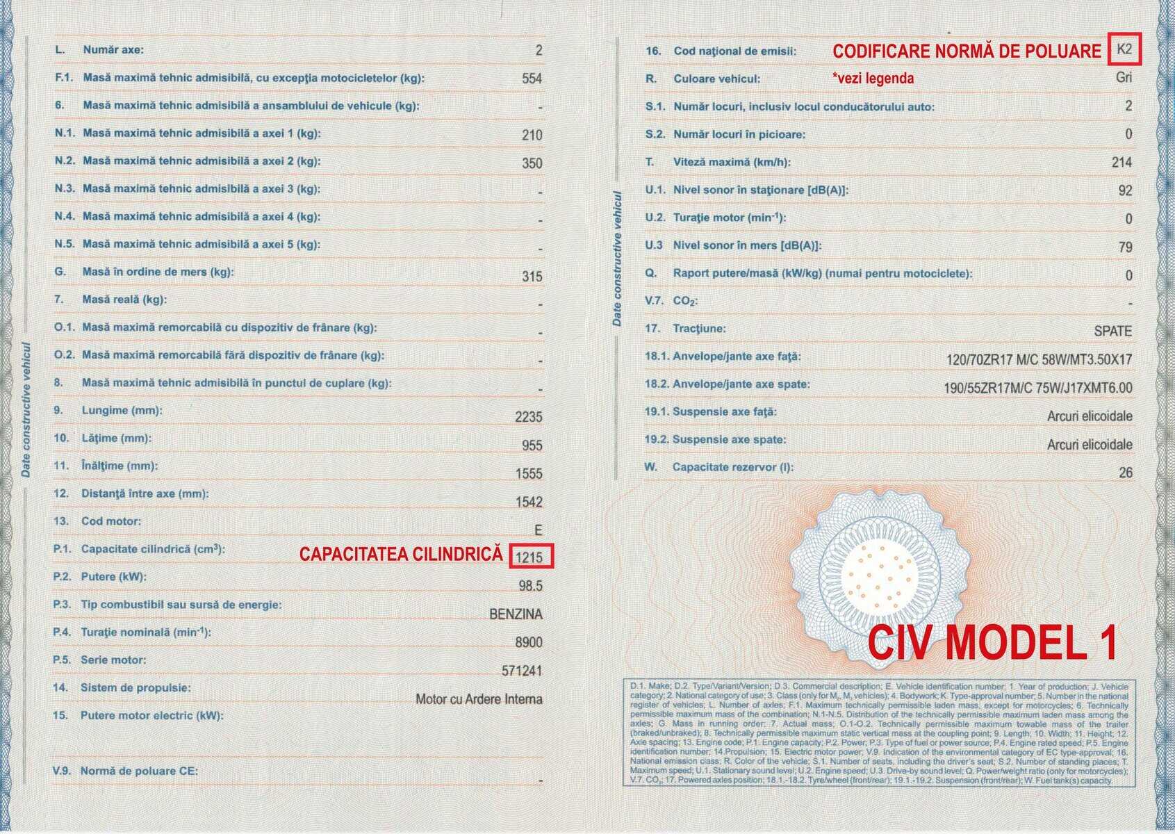 În acest document, capacitatea cilindrică este menționată la punctul 10, iar norma de poluare la punctul 5. Gradul de poluare este codificat prin ultimele două caractere ale numărului de omologare. Nu luați în calcul simbolul slash “/” și nici anul fabricației.