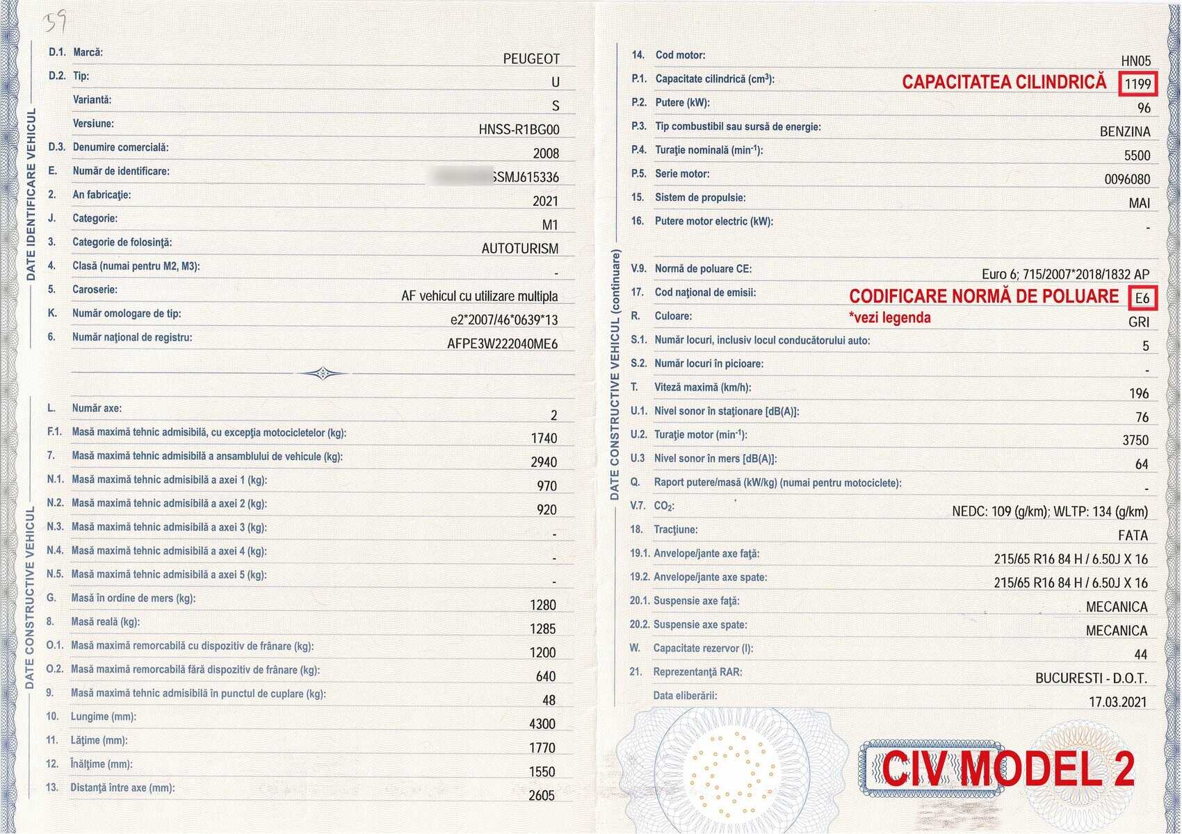 În acest document, capacitatea cilindrică este menționată la categoria P1, iar norma de poluare la punctul 16. Cod național de emisii.