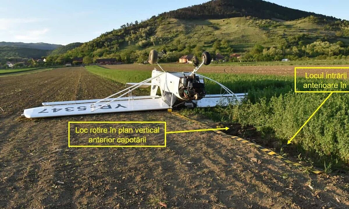 Potrivit raportului AIAS, pentru a evita avarierea palelor, pilotul a procedat la devierea stânga pentru a ieși din cultura de lucernă și a finaliza rulajul pe terenul vecin necultivat.