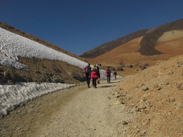 ”Prima porțiune este lină. Un drum lat, deșertic, cu “Ouă de Teide” din loc în loc. Aceste “ouă” sunt niște bolovani uriași care s-au format din lava rostogolită și întărită. Un proces asemănător bulgărilor de zăpadă. Și vorbind de asta, ne surprinde să vedem urme de zăpadă pe traseu. Parcă nu e locul lor în deșert.