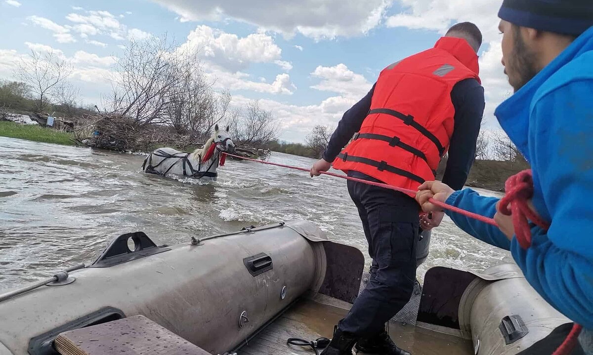 La sosirea echipajelor de intervenție la locul solicitării, două persoane împreună cu animalul și atelajul erau blocate în albia râului Mureș.