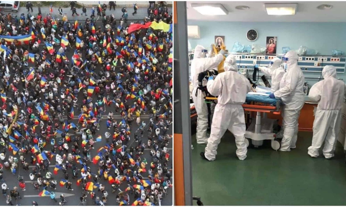 În timp ce câteva mii de persoane protestează sâmbătă seara la București față de măsurile anti-Covid, RO Vaccinare a publicat două imagini una lângă alta: una cu medici care luptă pentru salvarea unui pacient Covid, iar alta cu protestatarii anti-restricții.