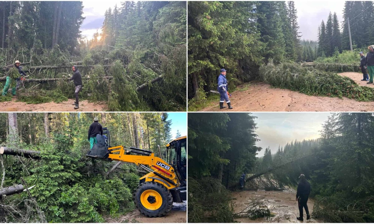 FOTO: Drumul dintre barajul Oașa și Poarta Raiului, BLOCAT de mulți copaci doborâți de vânt. Au intervenit localnincii