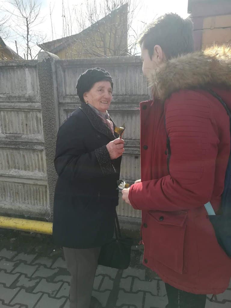 La sfârşitul programului au pornit pe străzile Teiuşului pentru a oferi femeilor pe care le întâlnesc acest mic simbol al renaşterii naturii, împodobit cu simbolul naţiunii româneşti.