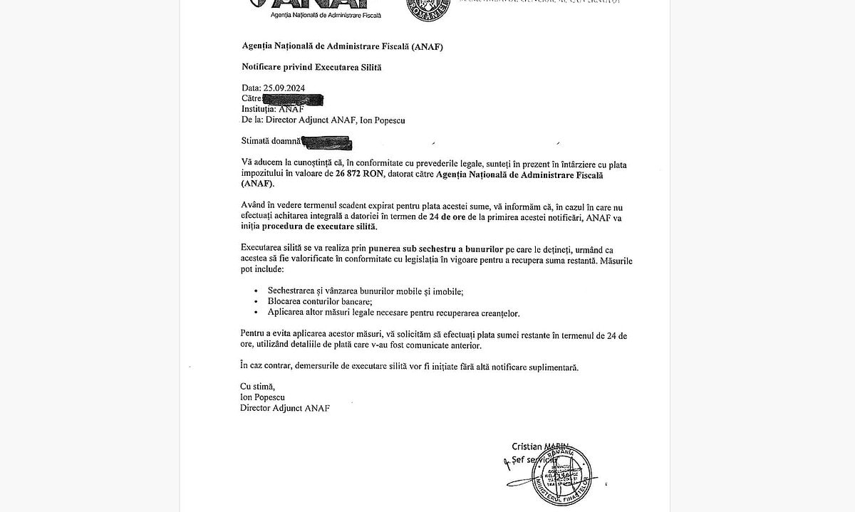 O nouă campanie de emailuri false, transmise în numele ANAF, este în desfășurare în această perioadă, au anunțat joi reprezentanții instituției. Contribuabililor, persoane fizice, le este transmisă o „Nota informativă” prin care sunt înștiințati cu privire la o presupusă datorie, pentru care este necesară plata pentru evitarea executării silite și a valorificării bunurilor.