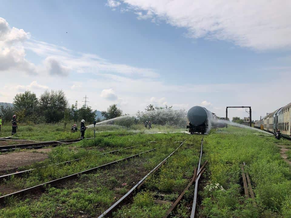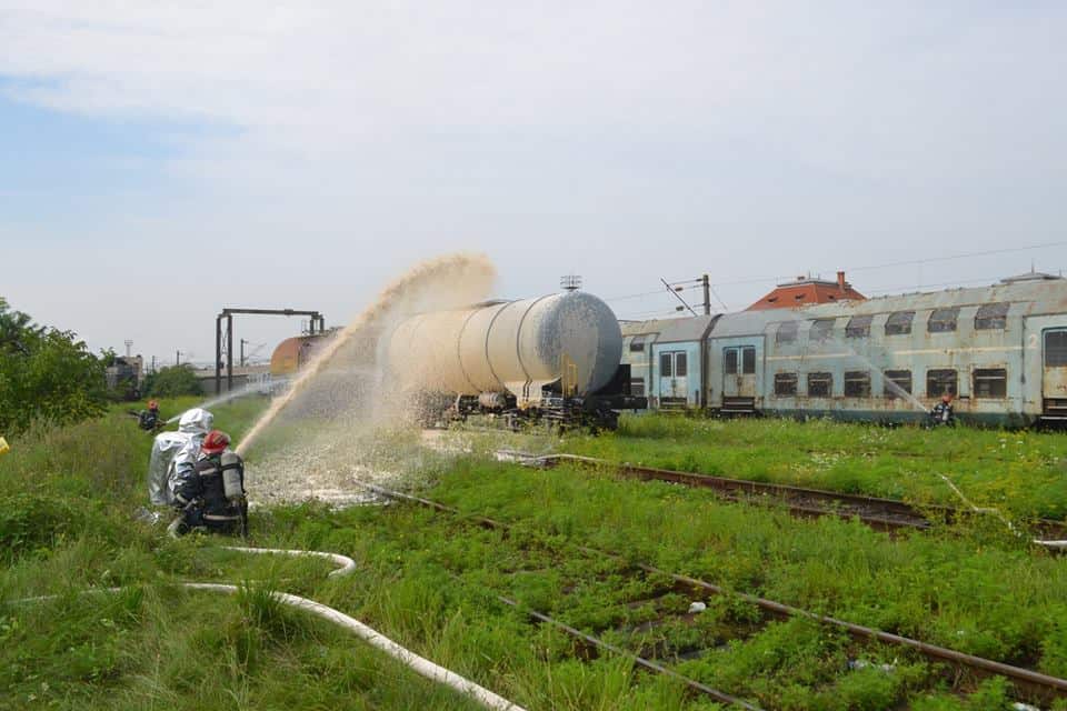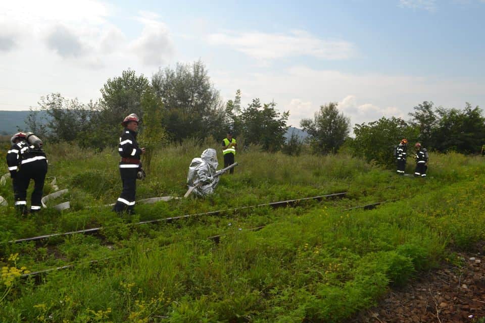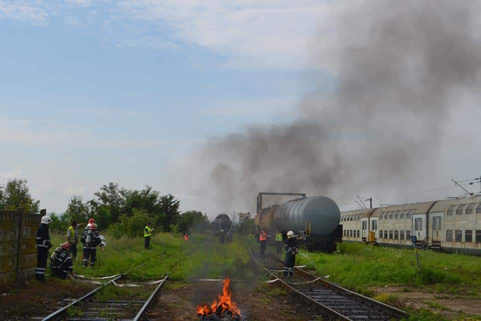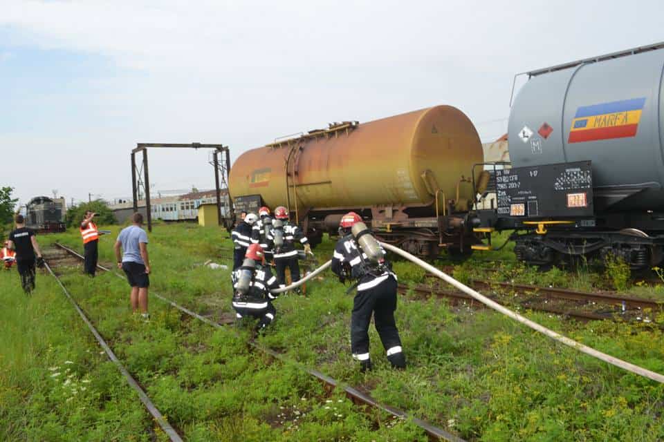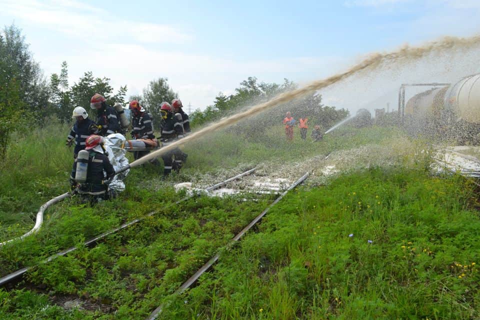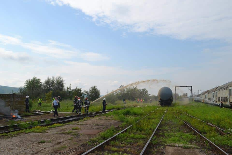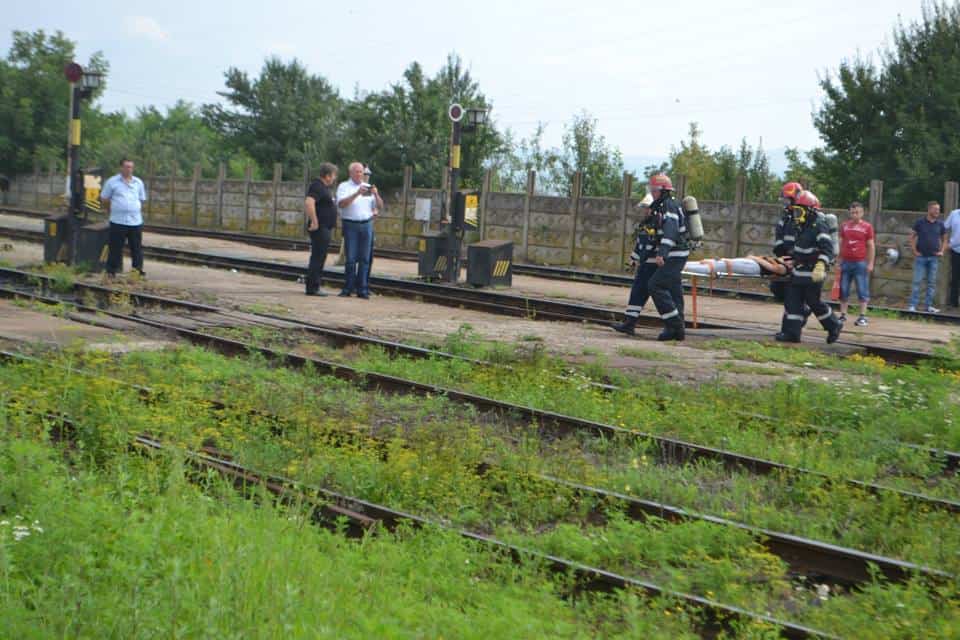FOTO: Exercițiu ISU Alba în Stația CFR Teiuș. În scenariu, incendiu la vagoane-cisternă și trei persoane rănite