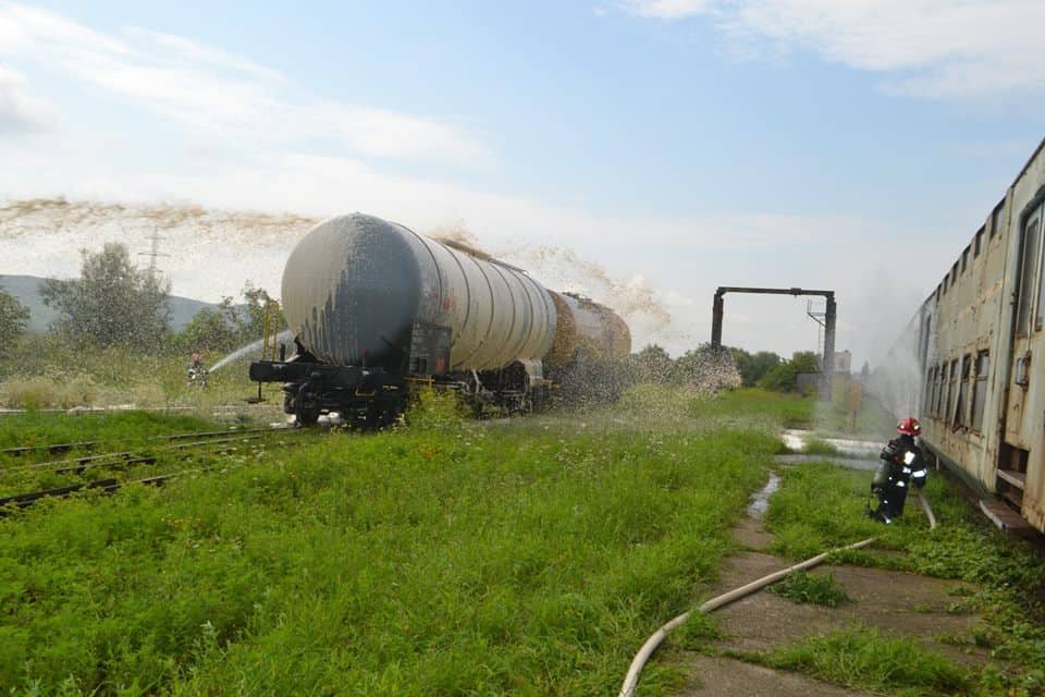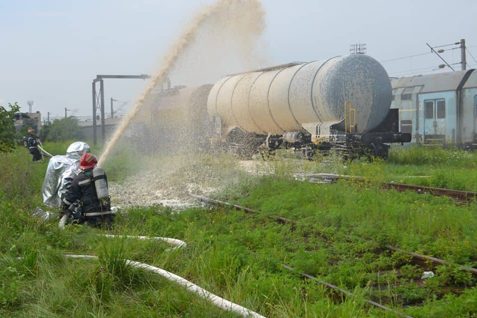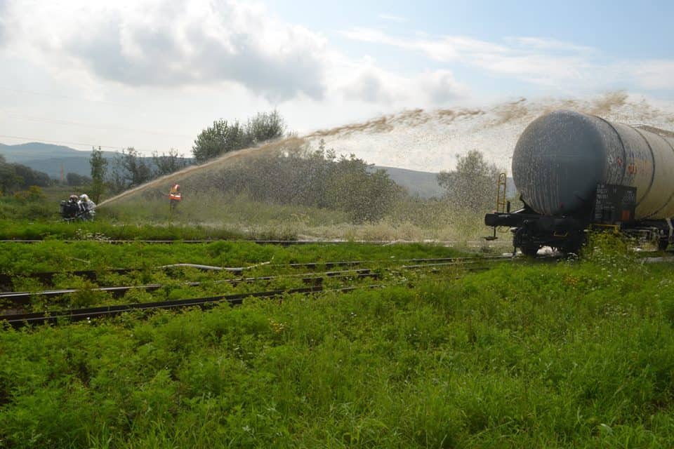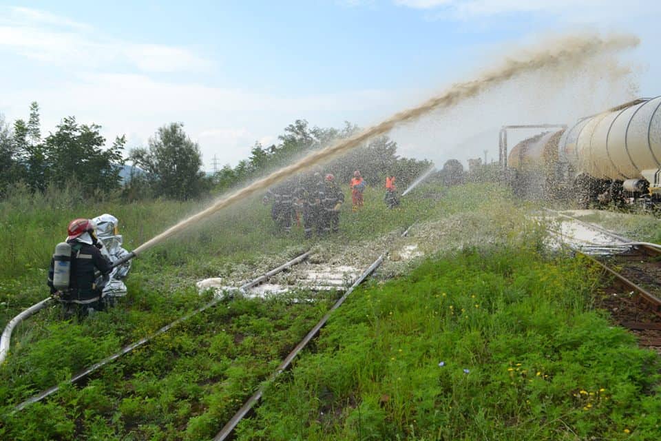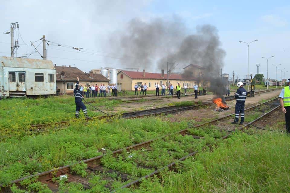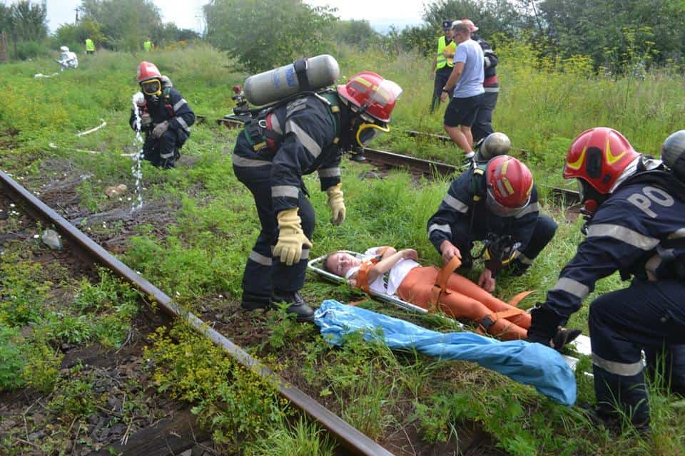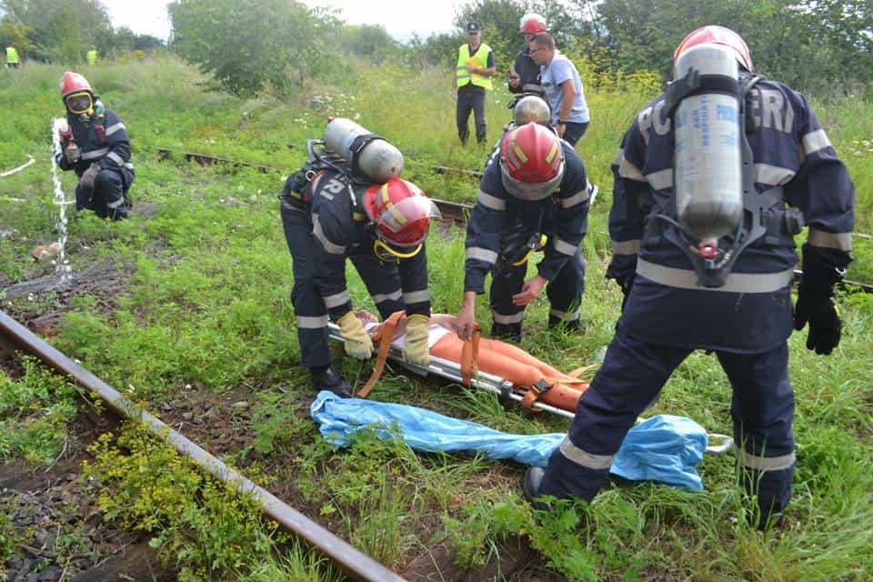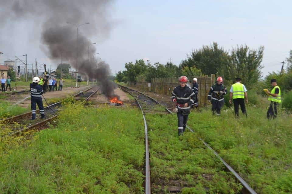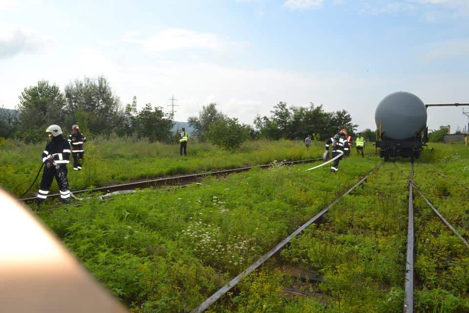 FOTO: Exercițiu ISU Alba în Stația CFR Teiuș. În scenariu, incendiu la vagoane-cisternă și trei persoane rănite