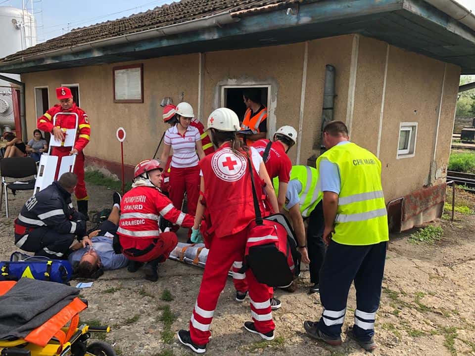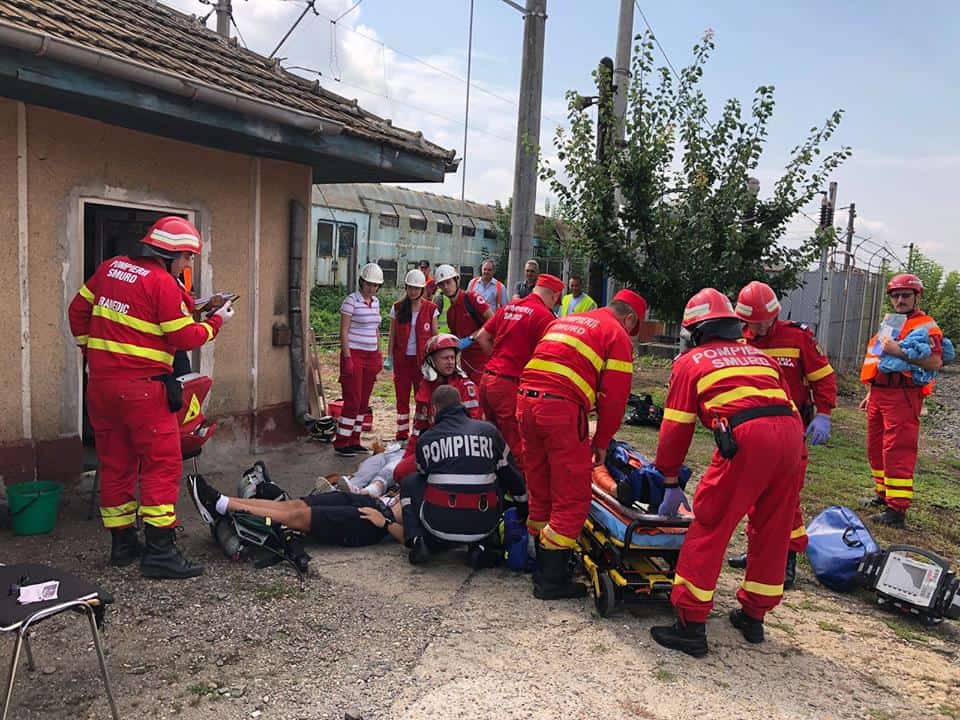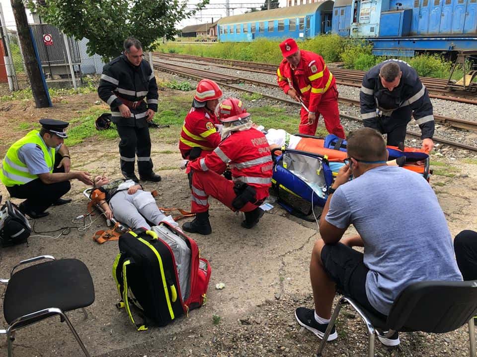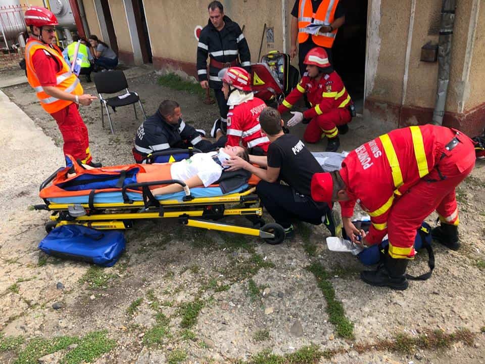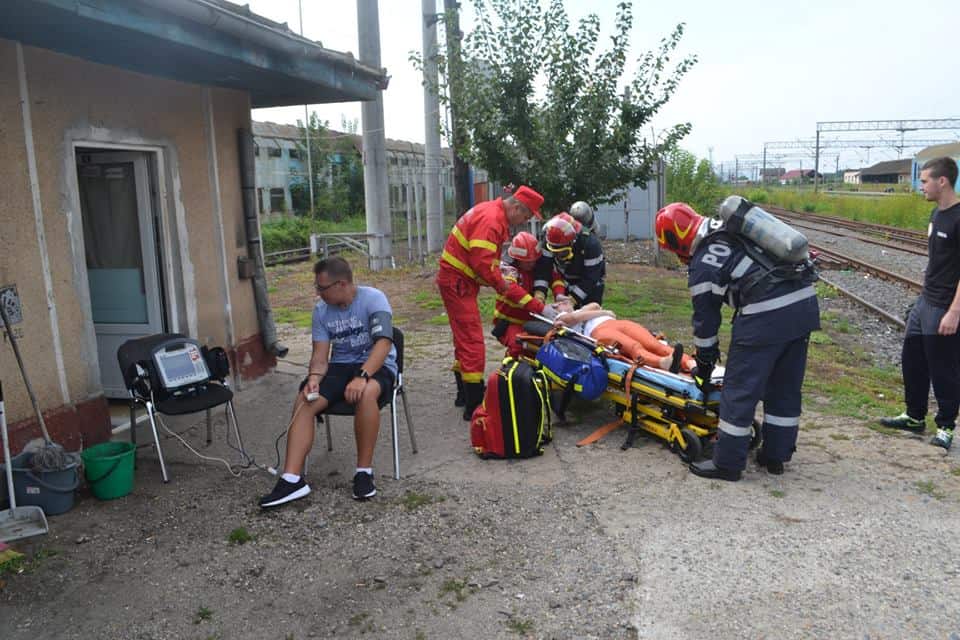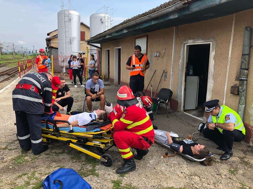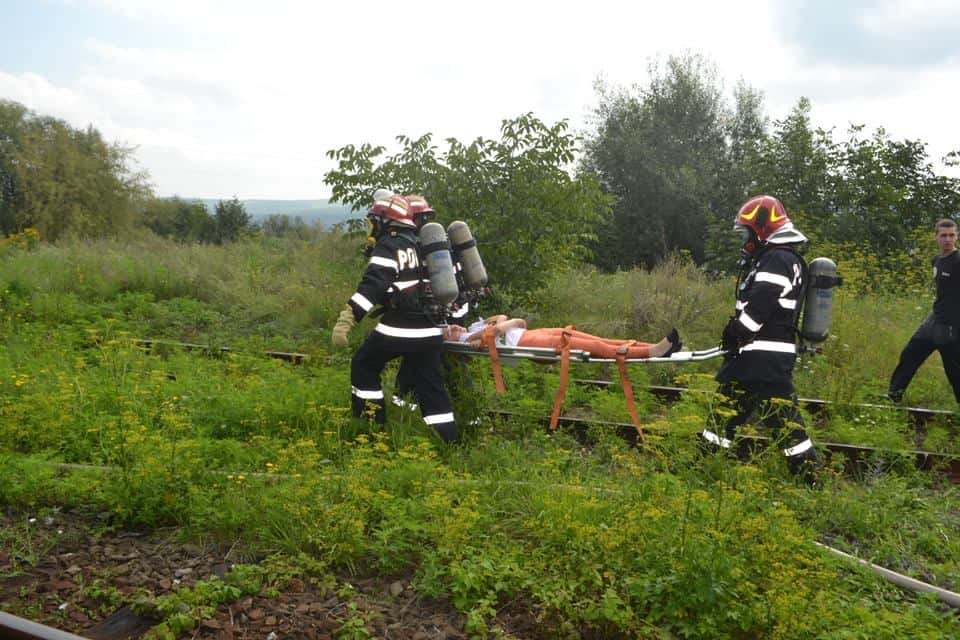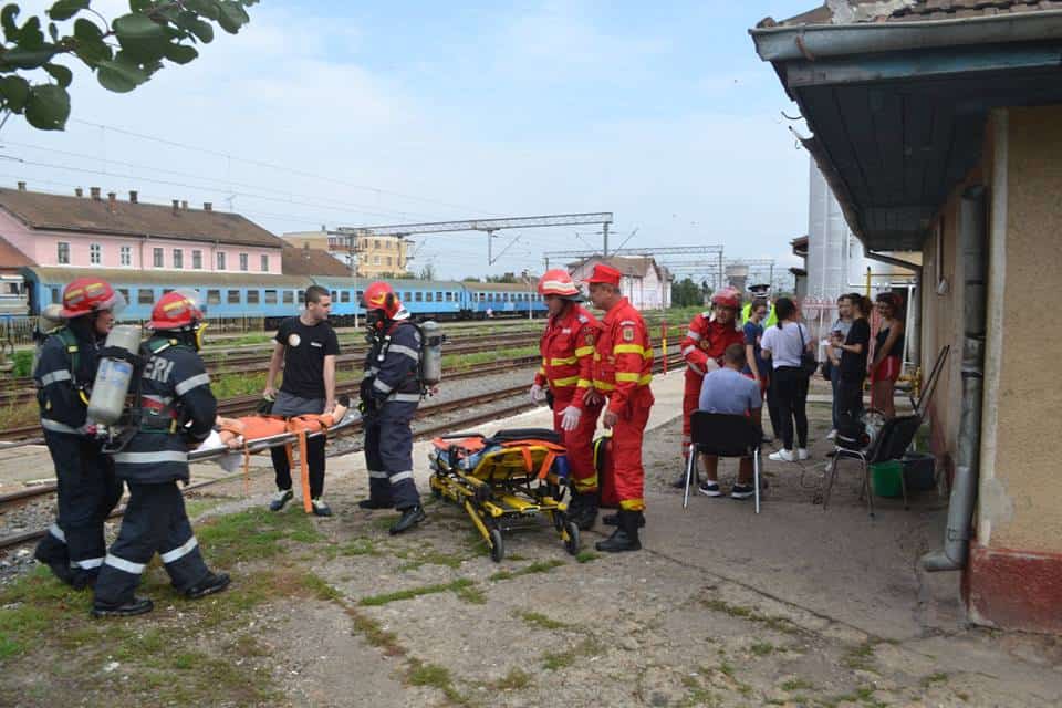 FOTO: Exercițiu ISU Alba în Stația CFR Teiuș. În scenariu, incendiu la vagoane-cisternă și trei persoane rănite