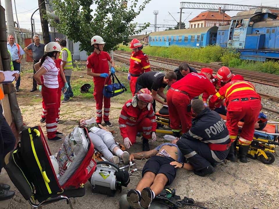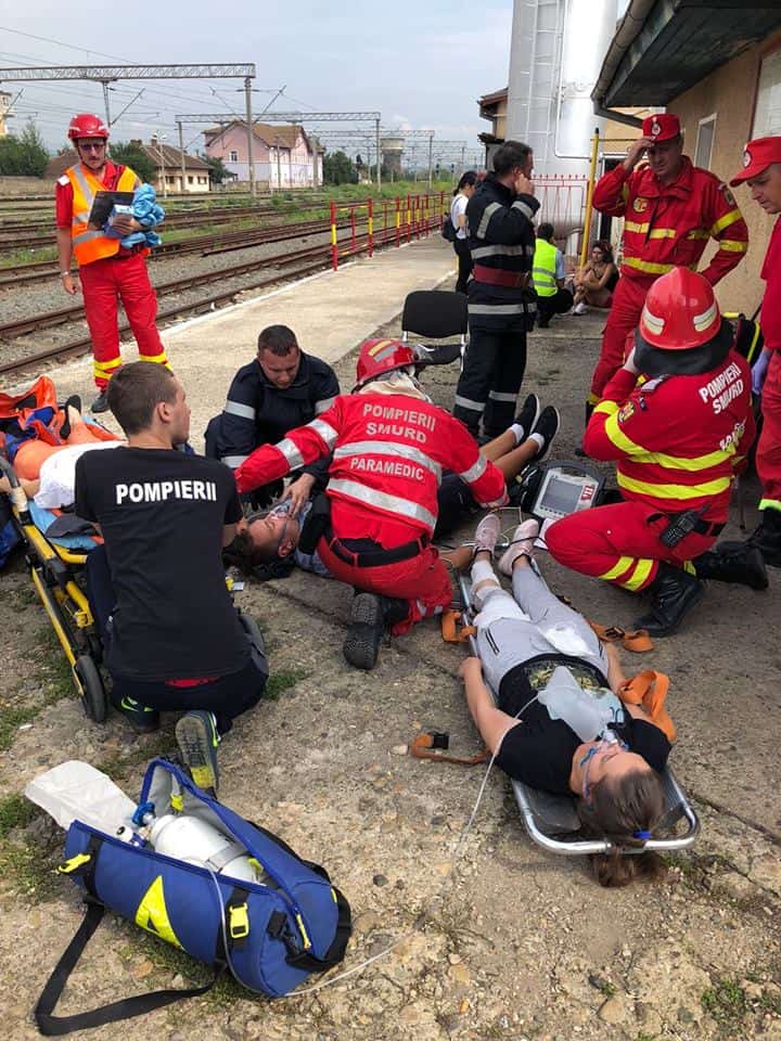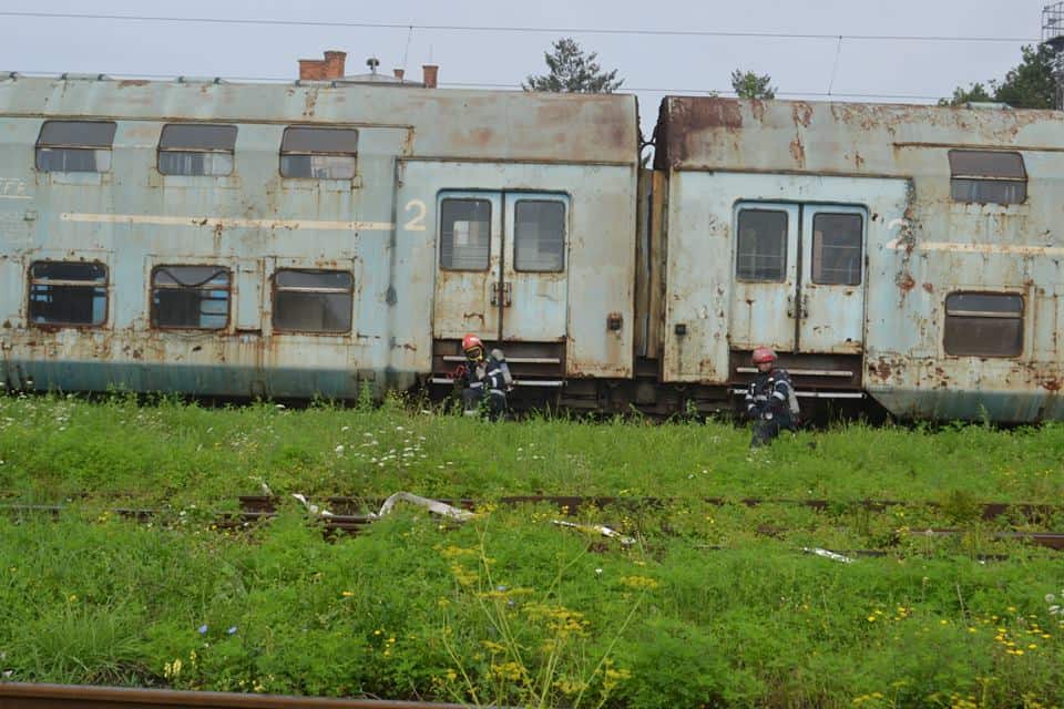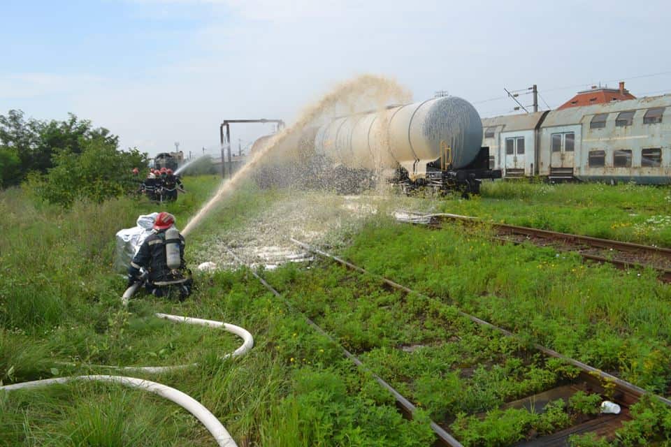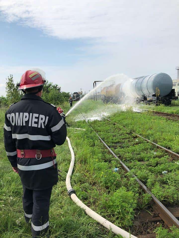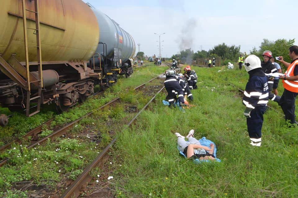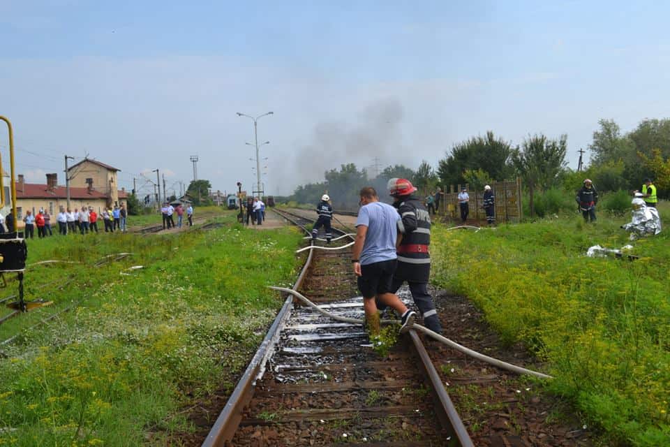 ajungând la locul intervenției, se constată că, incendiul se manifestă cu violență la cele două vagoane-cisternă, iar răbufnirea afectează două vagoane de călători, rănind trei persoane de la echipa de revizii și întreținere. Pe timpul desfășurării acțiunilor de acordare prim ajutor calificat/asistență medicală de urgență și evacuare a celor 3 victime (1 cod ROȘU, 1 cod GALBEN, 1 cod VERDE), echipajele de intervenție acționează pentru stingerea incendiului.