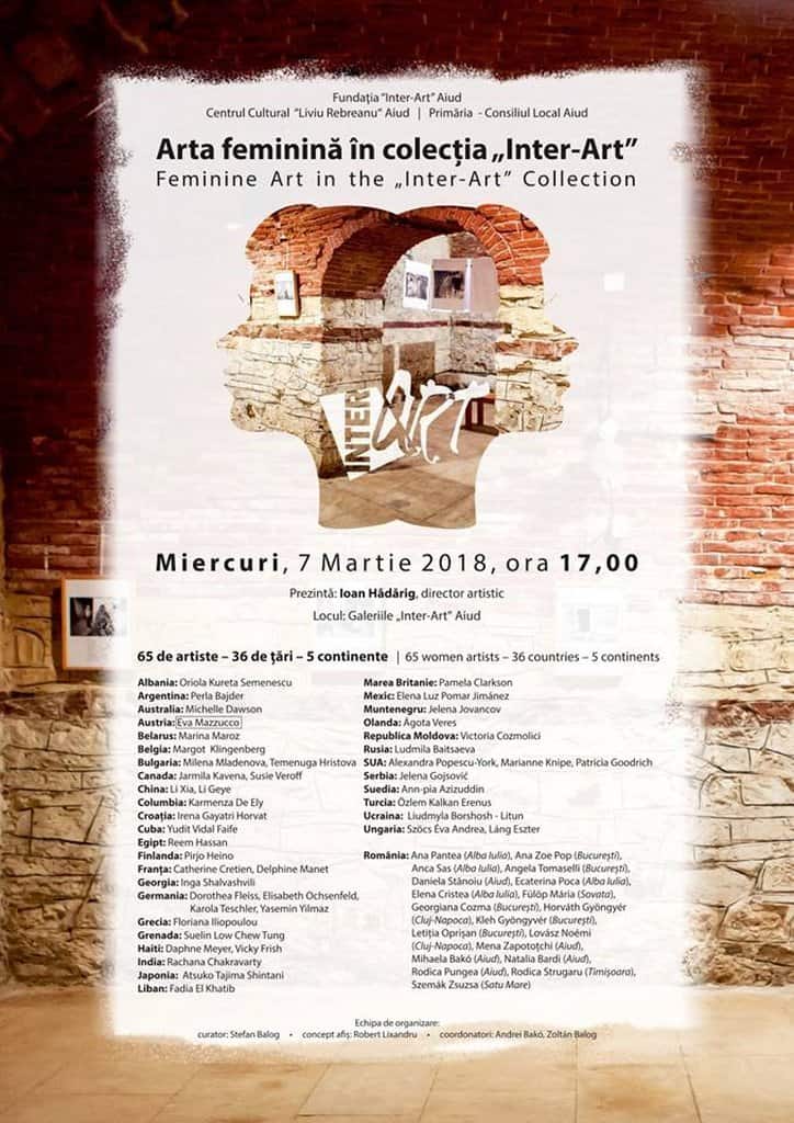 Galeriile Inter-Art Aiud găzduiesc cea mai complexă și amplă expoziție internațională de artă plastică feminină a anului 2018 cuprinzând lucrări semnate de 65 deartiste din 36 de țări de pe 5 continente sub genericul: Arta feminină în colecția „Inter-Art” .