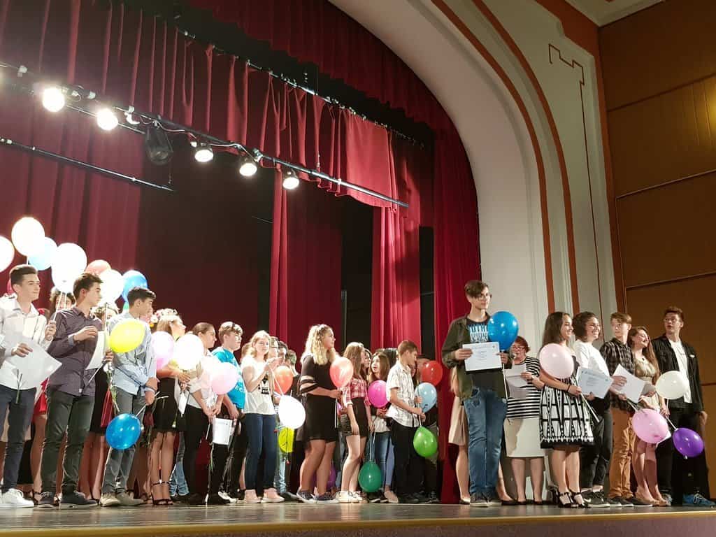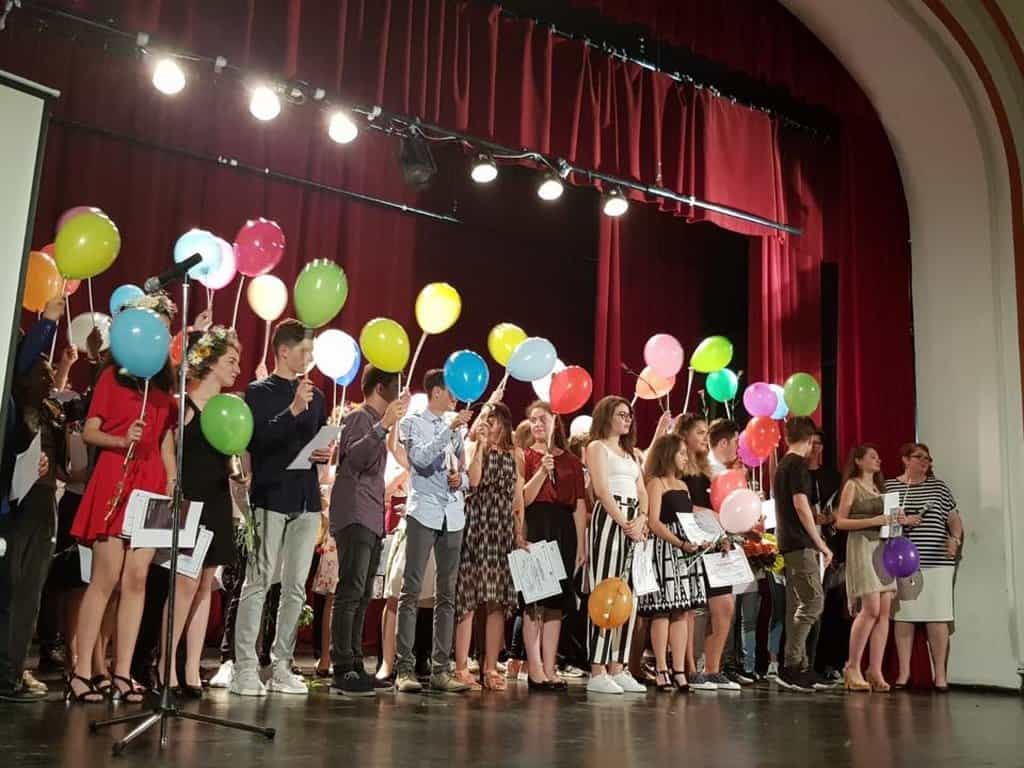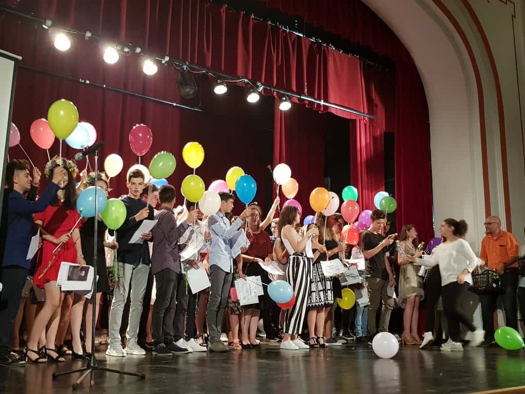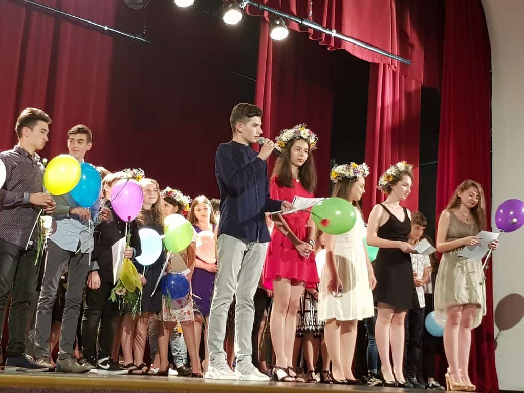 Pe acordurile imnului „Gaudeams igitur” și în aplauzele celor prezenți, toți cei șaizeci de absolvenți ai clasei a VIII-a au urcat pe scenă pentru ceremonia de absolvire, fiind întâmpinați de colegii lor mai mici din clasa a VII-a cu flori, baloane și cadouri.