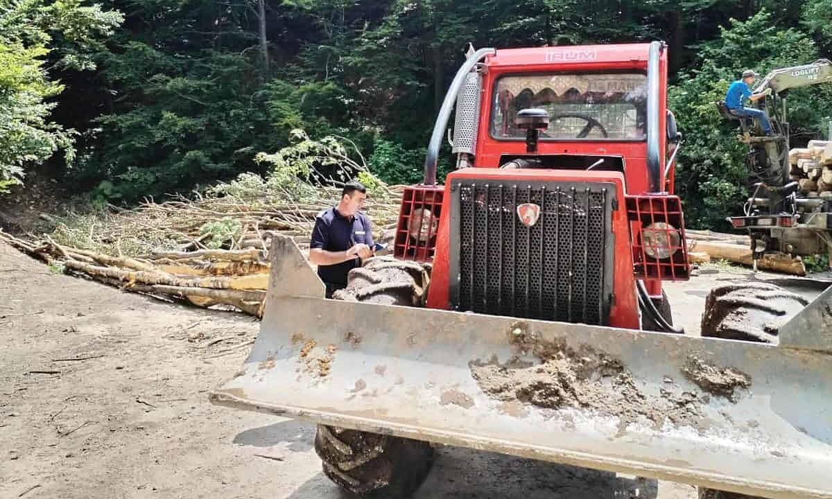 FOTO Firmă din Alba, amendată de jandarmii din Gorj. Un angajat, prins în timp ce transporta lemne cu un TAF prin albia unui pârâu