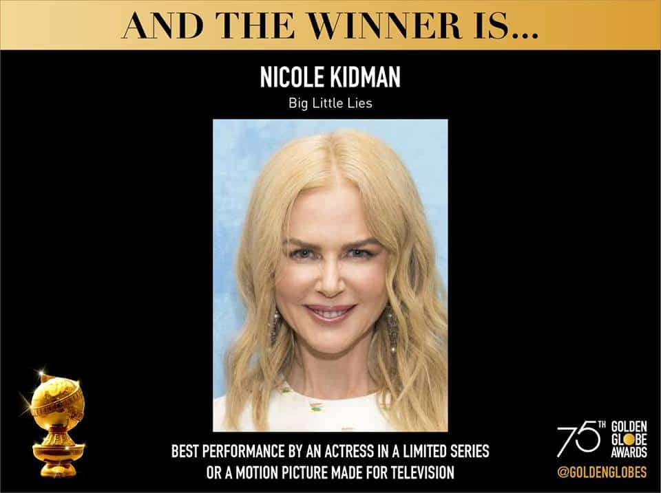 Nicole Kidman a câştigat primul Glob de Aur al serii, fiind considerată cea mai bună actriţă într-un miniserial sau film de televiziune pentru rolul său din „Big Little Lies”, în care joacă rolul unei femei bătute de soţul ei. Ea a avut cuvinte de laudă pentru colega sa de platou şi totodată coproducătoara miniserialului, Reese Witherspoon. „Wow, puterea femeilor!”, a spus Kidman după ce a primit al patrulea Glob de Aur al carierei.