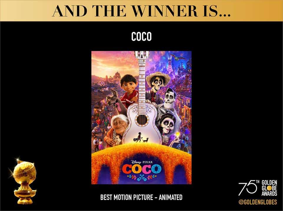 Producţia „Coco” a primit duminică seară, în cadrul celei de a 75-a ediţii a Globurilor de Aur decernate de Asociaţia presei străine de la Hollywood, premiul pentru cel mai bun film de animaţie. „Coco” a ratat însă trofeul pentru cel mai bun cântec original („Remember Me”), care a fost primit de „This Is Me”.