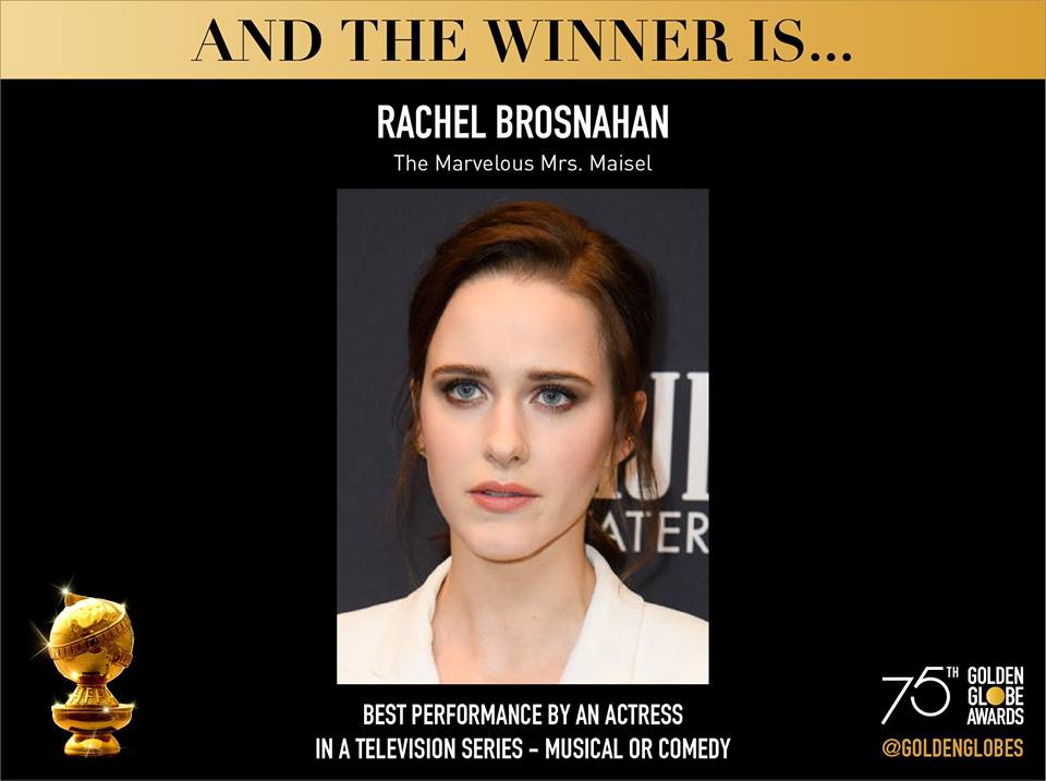 La rândul ei, actriţa Rachel Brosnahan a primit Globul de Aur pentru cea mai bună actriţă într-un serial de comedie sau musical pentru rolul ei din „The Marvelous Mrs. Maisel”.