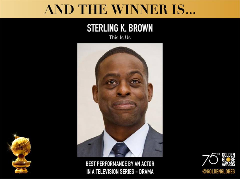 Globul de Aur pentru cel mai bun actor principal într-un serial dramatic a fost primit de Sterling K. Brown, pentru rolul din „This Is Us”.