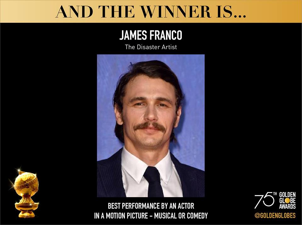 Actorul James Franco a obținut premiul pentru cel mai bun actor într-un film comedie sau musical, pentru rolul din „The Disaster Artist”, unde a concurat cu Steve Carell („Battle of the Sexes”), Ansel Elgort („Baby Driver”), Hugh Jackman („The Greatest Showman”) şi Daniel Kaluuya („Get Out”). „The Disaster Artist” relatează epopeea unui film ratat de la Hollywood, în care actorul joacă alături de fratele său Dave şi de Seth Rogen. Pelicula spune povestea turnării filmului „The Room” de Tommy Wiseau, căruia James Franco i-a mulţumit când a primit premiul şi care l-a însoţit pe scenă. „Sunt încântat să împart acest moment cu el astăzi”, a spus Franco, regizorul şi totodată actorul principal din „The Disaster Artist”.