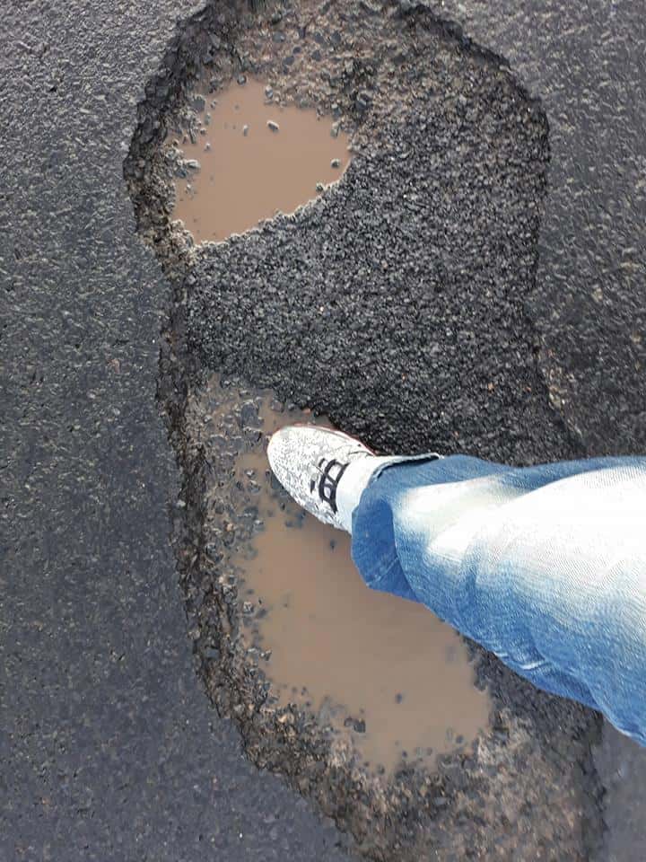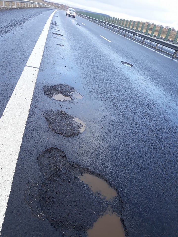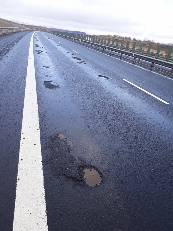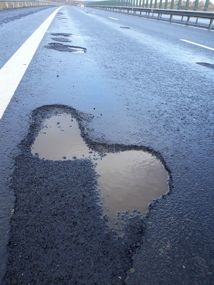Pe imagini se poate observa că unele gropi de pe segmentul de autostradă au fost „peticite” anterior, însă plombele au sărit și porțiunea de șosea arată ca un drum de țară.