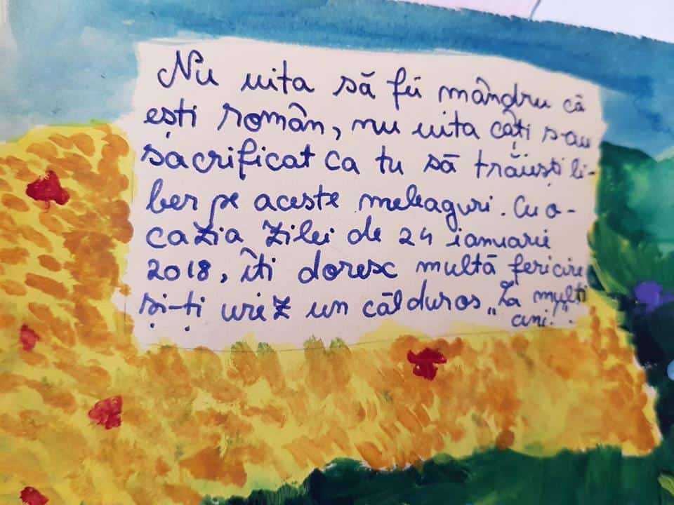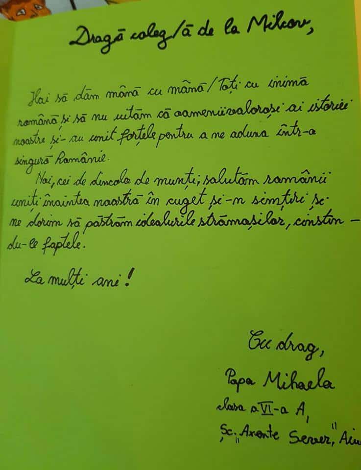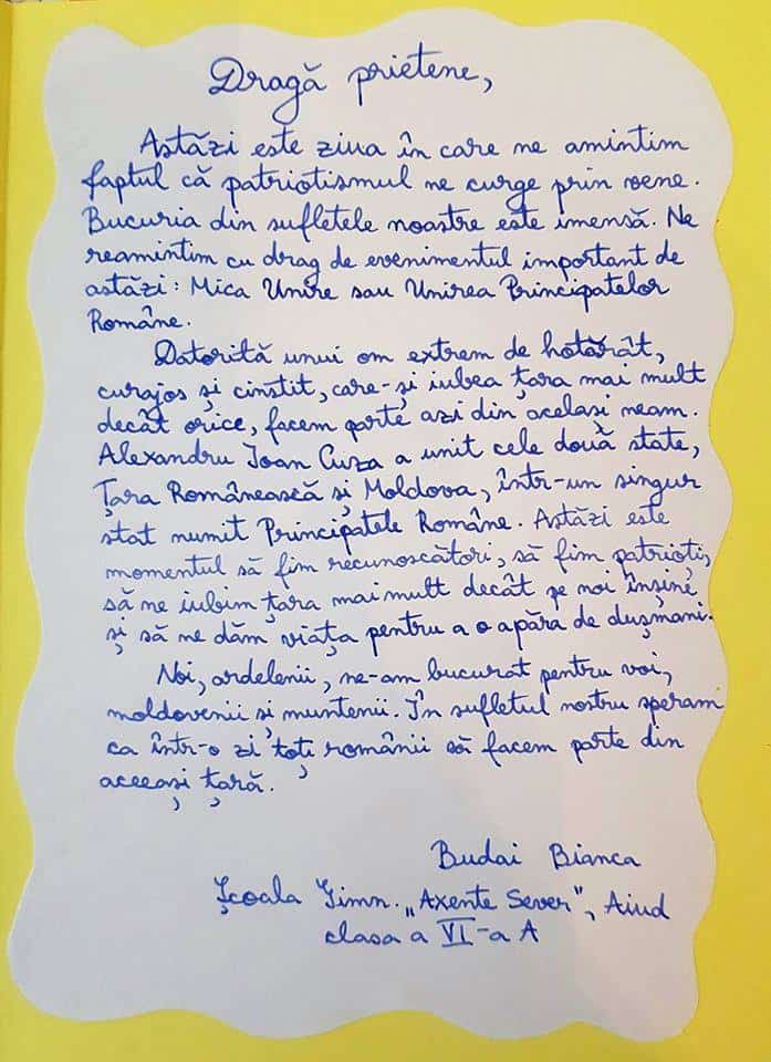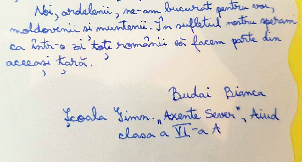 Pentru a dovedi că distanța dintre cele două localități nu este o deloc o opreliște, atunci când vrem să ne manifestăm sentimentele și recunoștința vis-a-vis de acest moment crucial din istoria națiunii române, elevii de gimnaziu aiudeni au realizat 159 de felicitări, pe care le-au expediat atât unor elevi de aceeași vârstă cu ei din municipiul Focșani, cât și altor categorii de cititori ai Bibliotecii Județene „Duiliu Zamfirescu” Vrancea, devenită partener de seamă al acestui proiect.