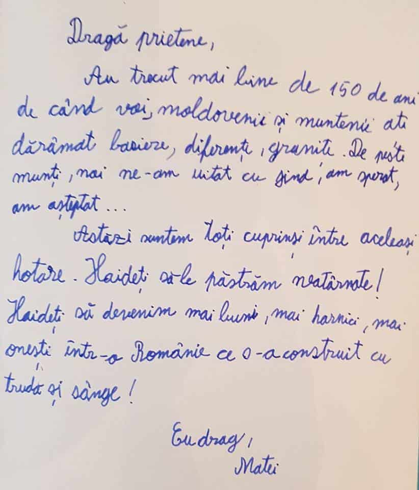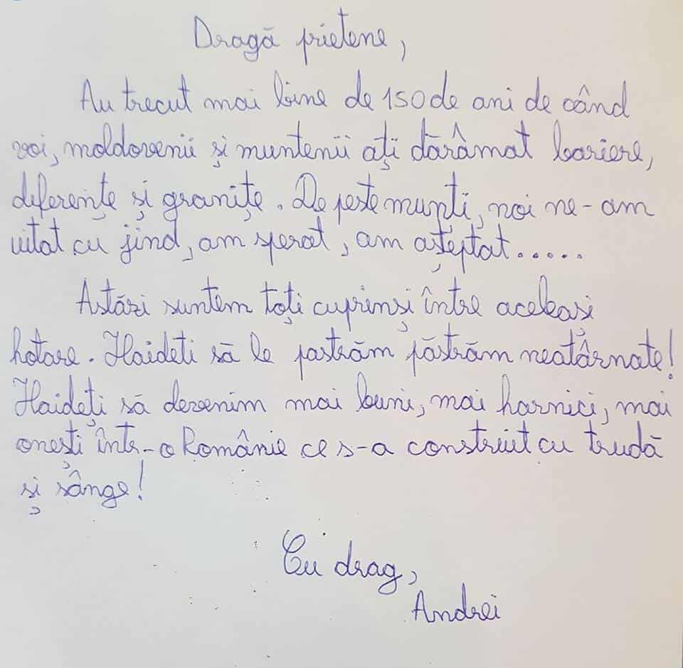 „În speranța că acest parteneriat se va dezvolta pe mai multe paliere, mai ales în acest an, în care vom sărbători Centenarul Marii Uniri, iar exemplele de bună practică în ceea ce privește activitățile cultural-educaționale derulate între localități diverse de pe întreg teritoriul țării noastre trebuie să fie tratate cu seriozitate, nu putem decât să-i felicităm pe toți elevii implicați, pe cadrele didactice și pe partenerii noștri din Focșani (Biblioteca Județeană „Duiliu Zamfirescu” Vrancea și Primăria municipiului Focșani).