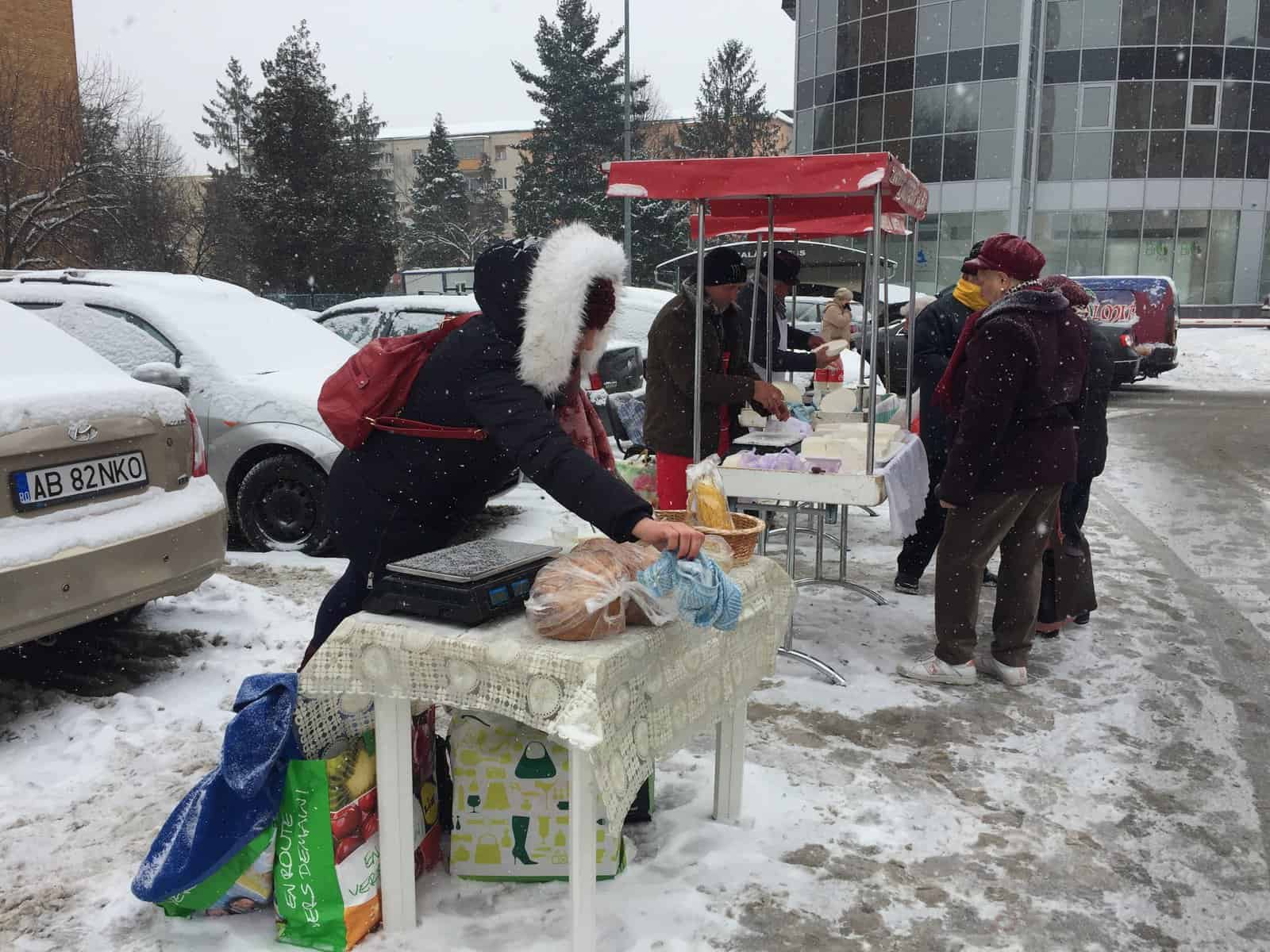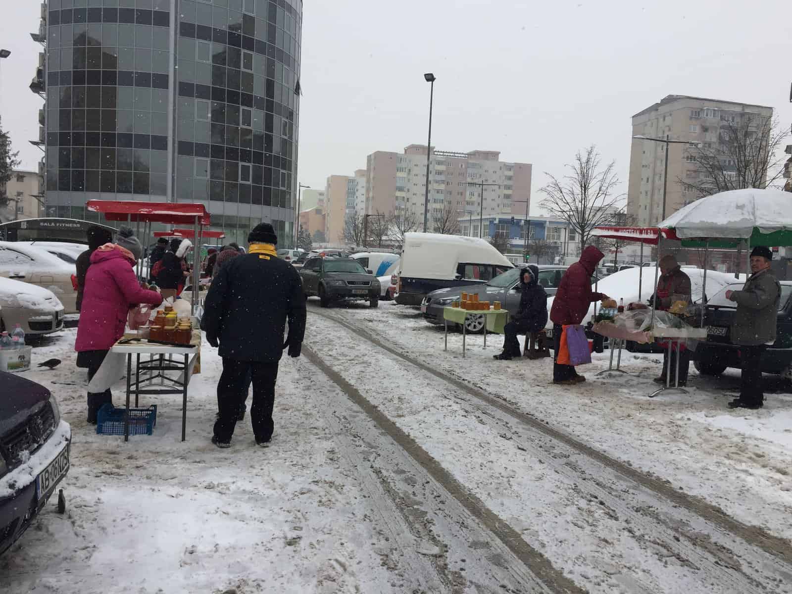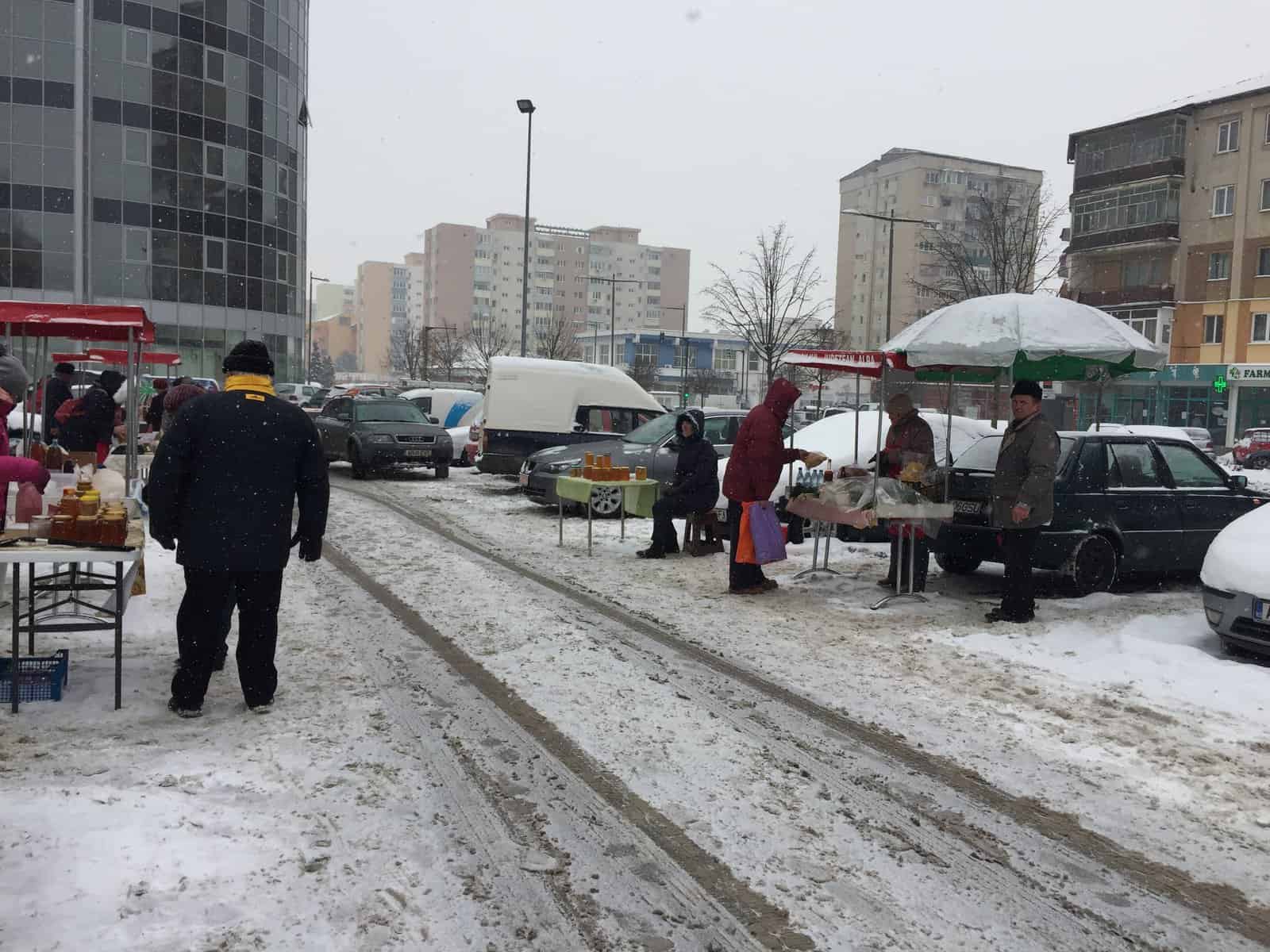 Brânză, lapte, miere și pâine. Aceste produse se aflau pe cele șase tarabe puse printre mașini, în piața volantă. Chiar dacă afară era ger și ninsoarea nu dădea semne să se oprească, câțiva comercianți și-au făcut curaj să iasă cu marfa la vânzare.