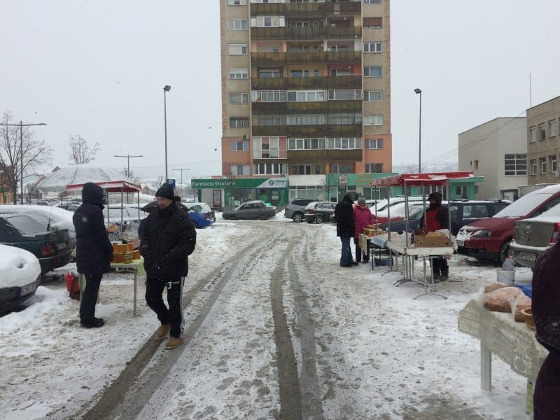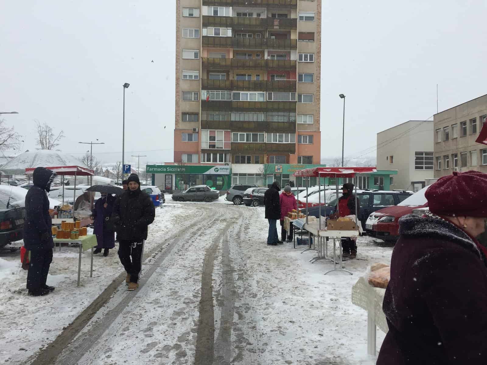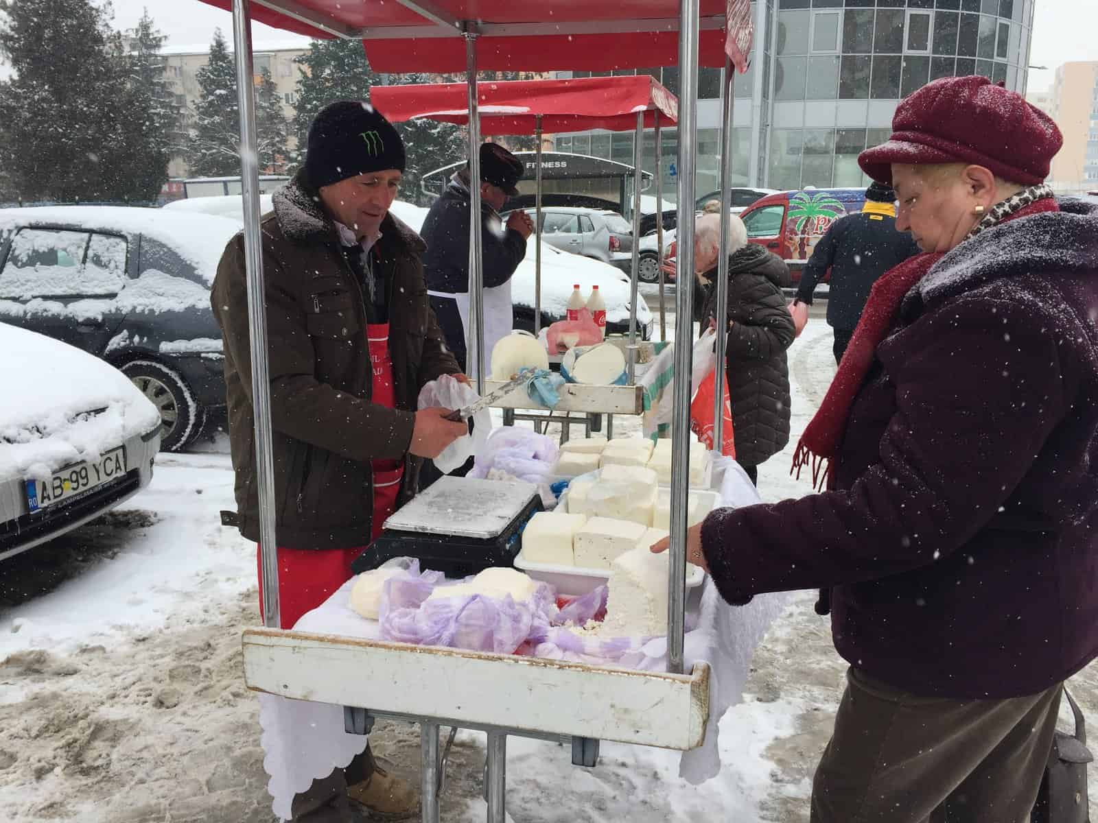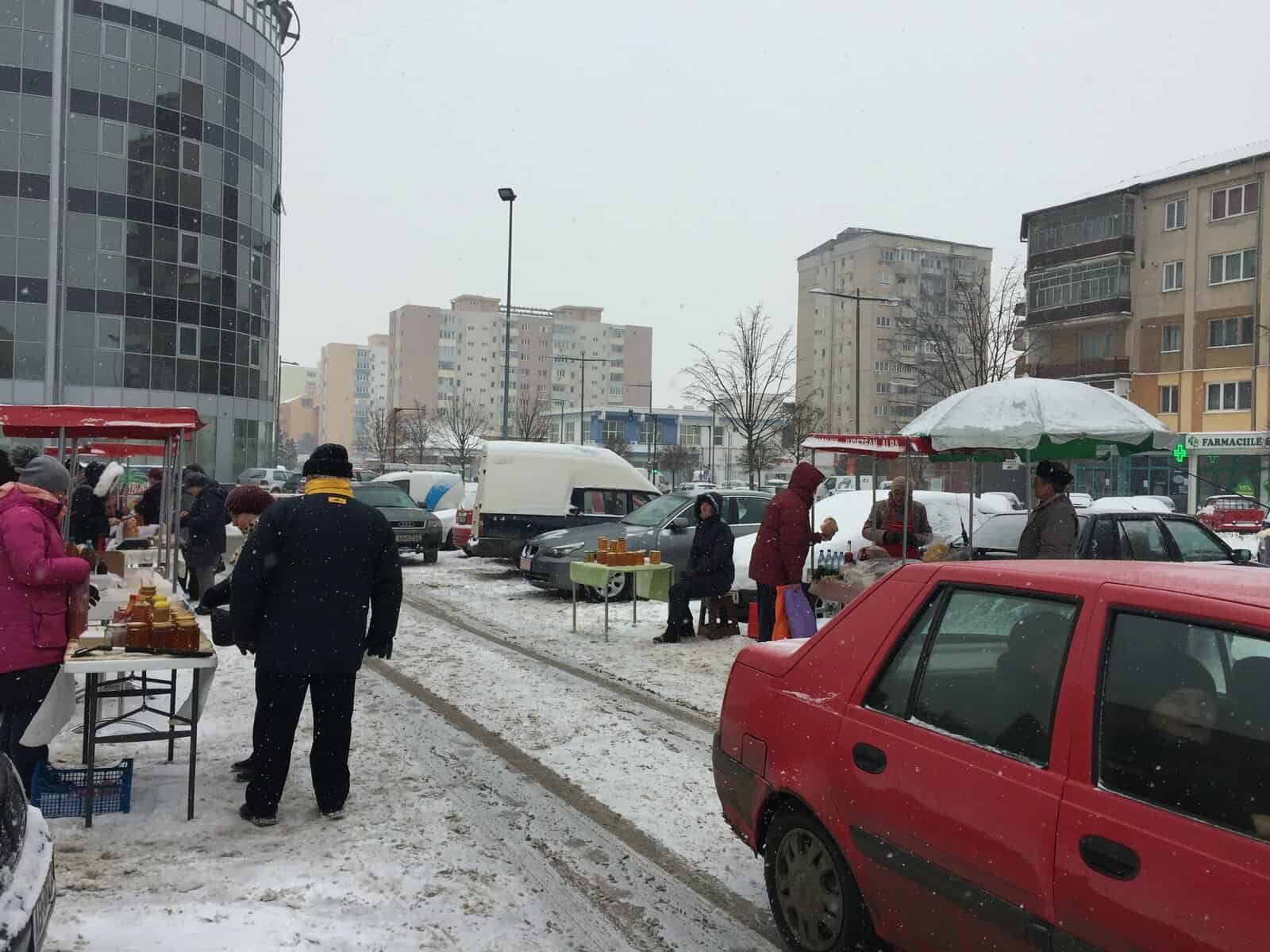 Brânză, lapte, miere și pâine. Aceste produse se aflau pe cele șase tarabe puse printre mașini, în piața volantă. Chiar dacă afară era ger și ninsoarea nu dădea semne să se oprească, câțiva comercianți și-au făcut curaj să iasă cu marfa la vânzare.