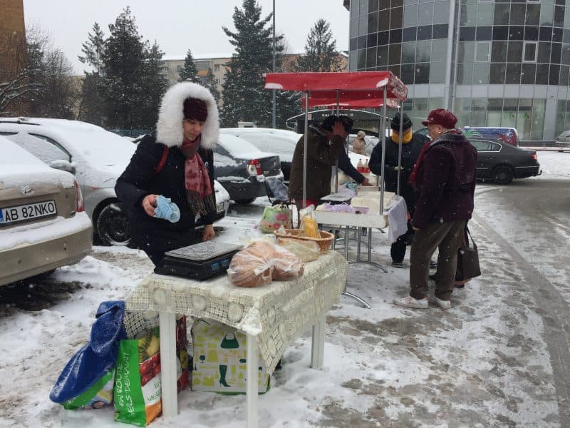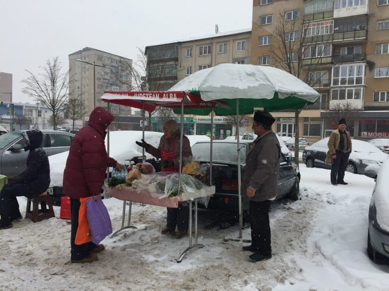 Vineri dimineața, -9 grade Celsius, ninsoare. Pe o astfel de vreme nimeni nu s-ar gândi să iasă din casă, darămite să mai stea în drum pentru doar câțiva lei. Însă pentru ei, cei șase comercianți din Piața Volantă din Alba Iulia, pe care i-a prins gerul la muncă în a doua zi din luna martie, nu contează vremea. Se trezesc dis-de-dimineață, își pregătesc marfa și vin în parcarea din zona Spitalului Județean pentru a-și vine produsele.