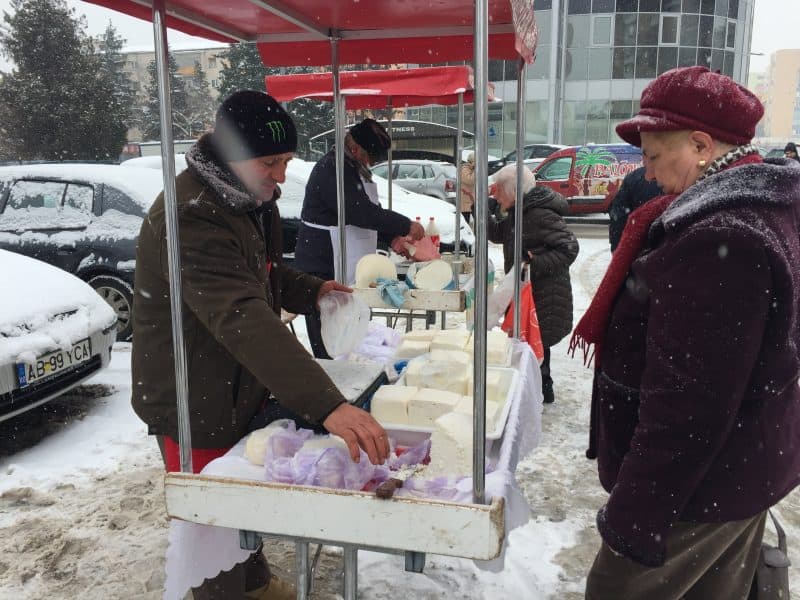 „Vin aici în fiecare vineri. Tot de la dânsul cumpăr și brânză și ouă, chiar și găini”, ne spune o doamnă care gusta din telemeaua puțin înghețată.