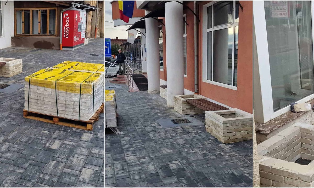 FOTO: Lucrări de modernizare în orașul Teiuș. Se montează mobilierul urban din apropierea Primăriei