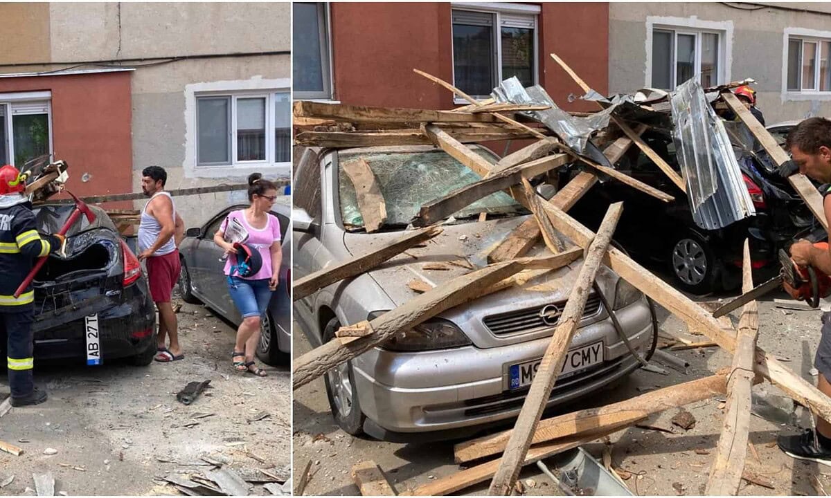 Vijelia a făcut ravagii la Ocna Mureș. Un acoperiș smuls de vânt a căzut peste mai multe autoturisme parcate în fața unui bloc din localitatea Uioara de Sus, Ocna Mureș. Incidentul s-a petrecut duminică, 24 iulie, în jurul orei 15.40.