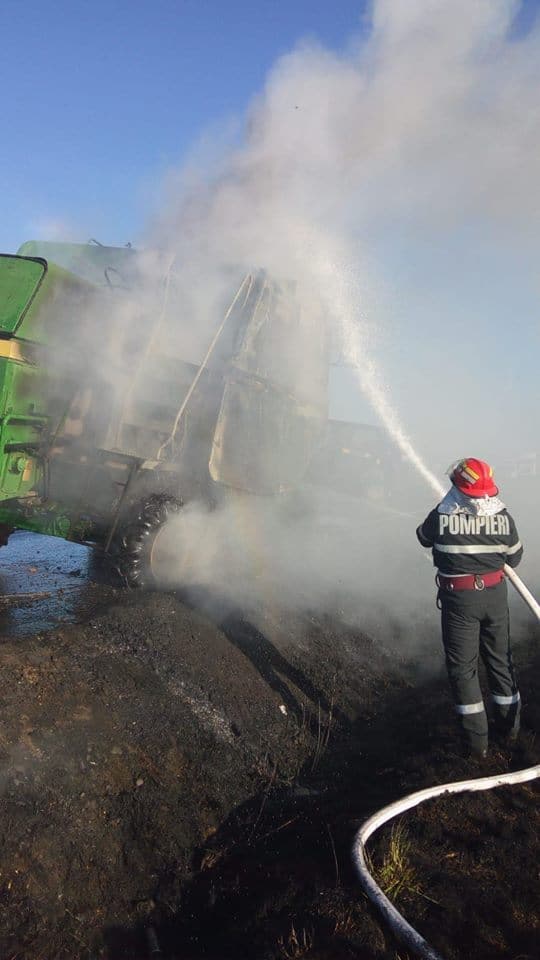 UPDATE 22:00 : Utilajul a ars în proporție de 50%, pagubele se ridică la 90.000 de lei. Cauza producerii incendiului este un scurt circuit la instalația electrică.