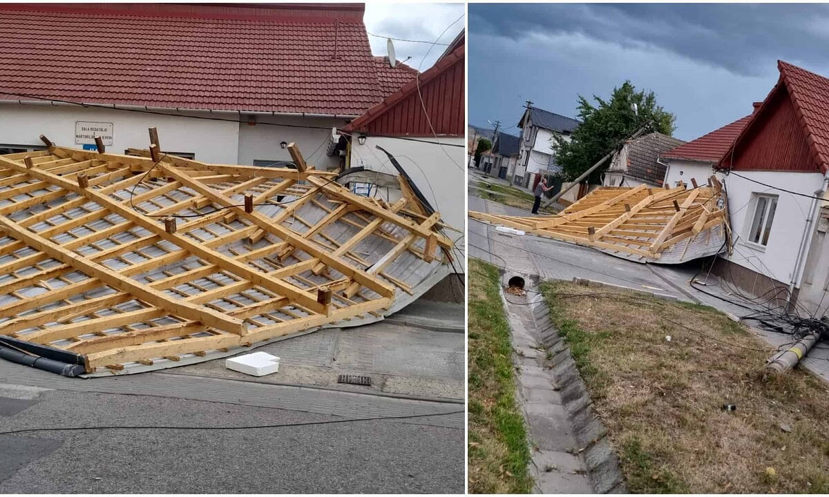 UPDATE FOTO-VIDEO: Pagube provocate de furtuna puternică din Alba. Acoperișuri luate de vânt și stâlpi de electricitate doborâți