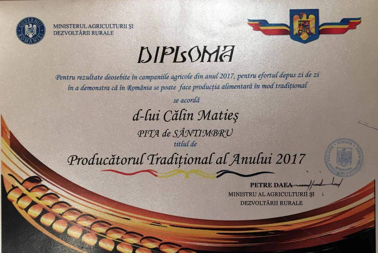 “Pita de Sântimbru” este, pentru a doua oară, “Produsul tradiţional al anului”. După prima distincţie primită de producătorul din Alba, în 2015, titlul a fost acordat şi în 2017, de către Ministerul Agriculturii, în cadrul târgului internaţional “Indagra”.