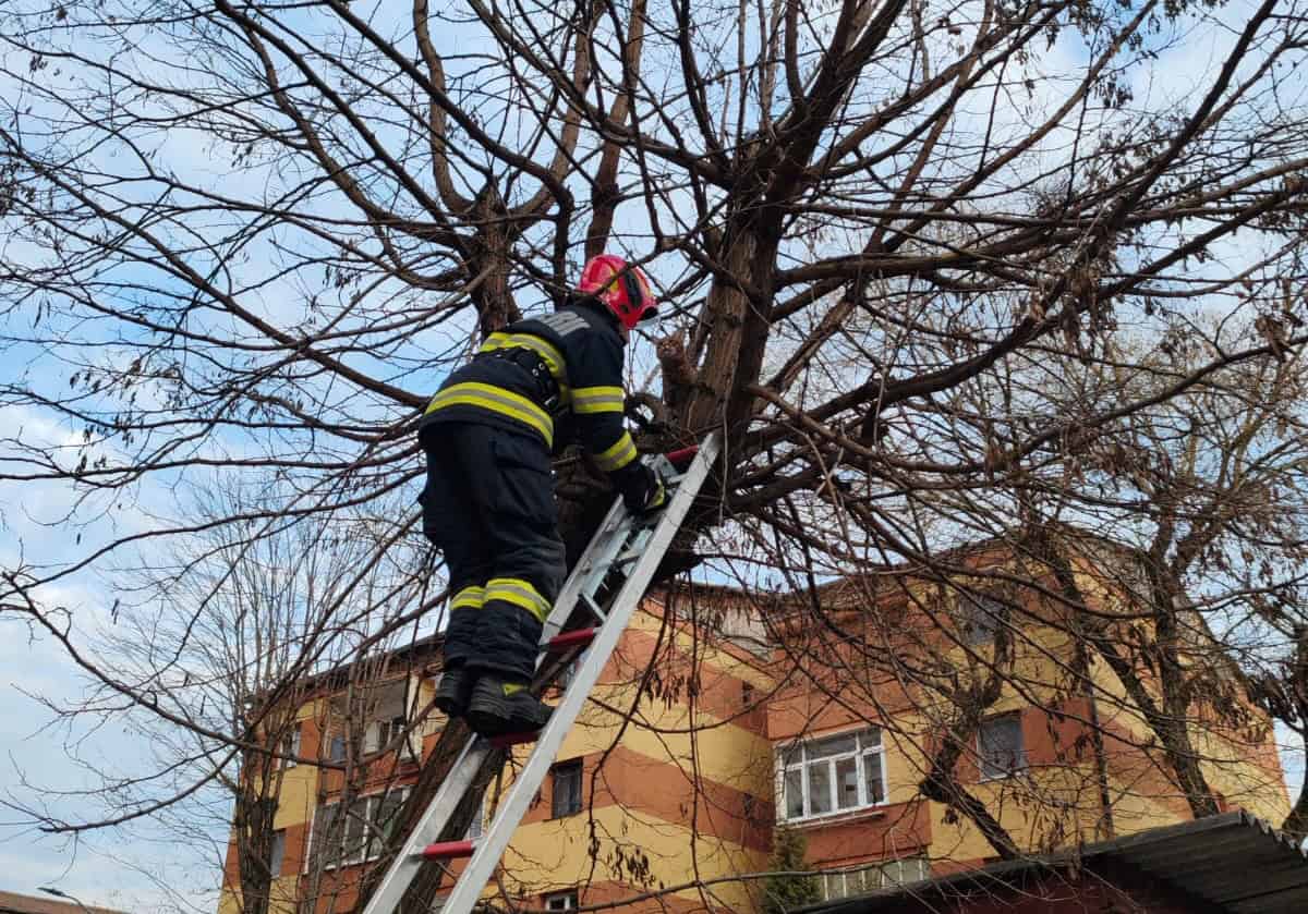 Obiectul intervenției a fost unul mai atipic, dar care a necesitat prezența pompierilor militari. O pisică a rămas blocată în copac.
