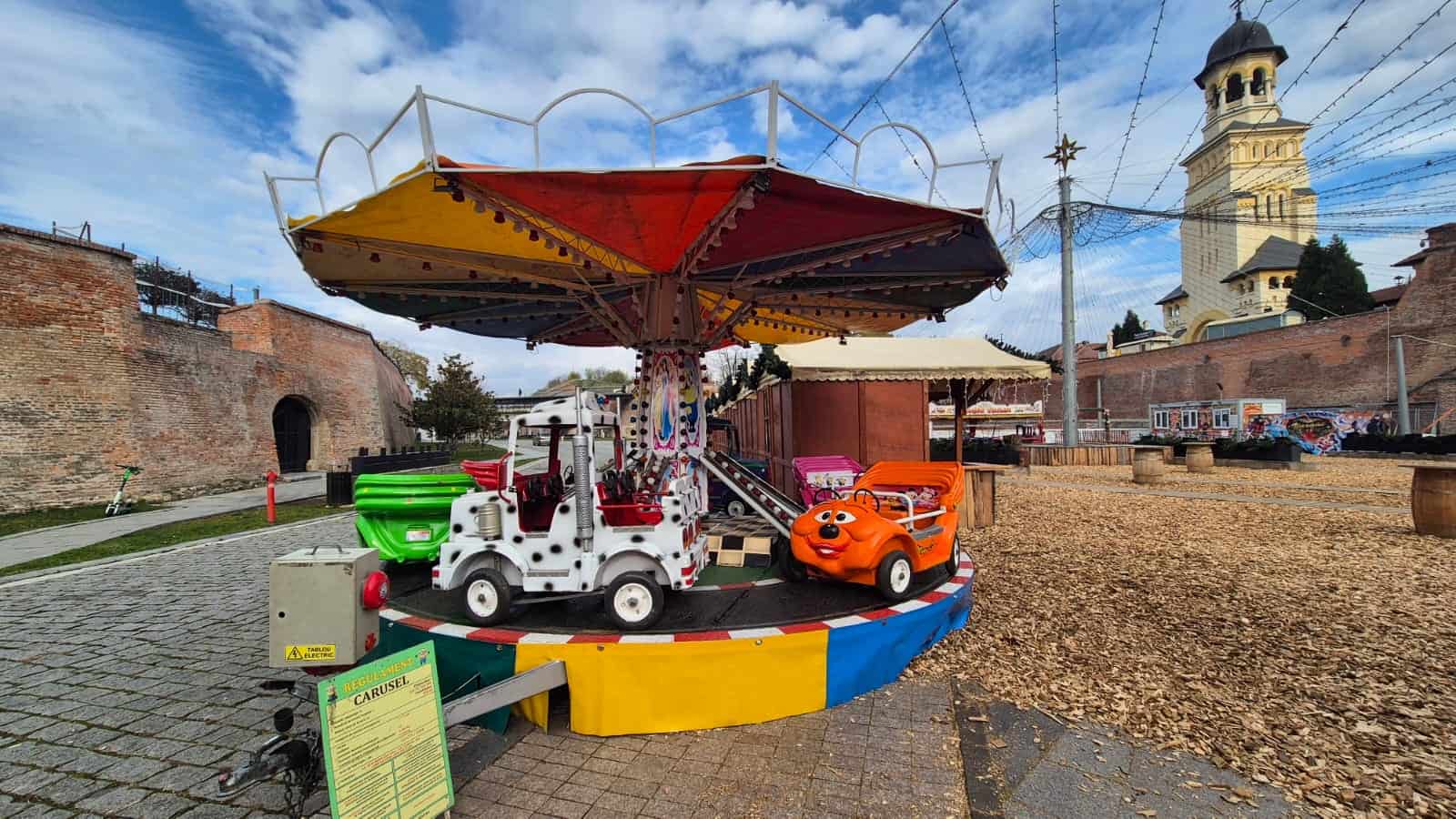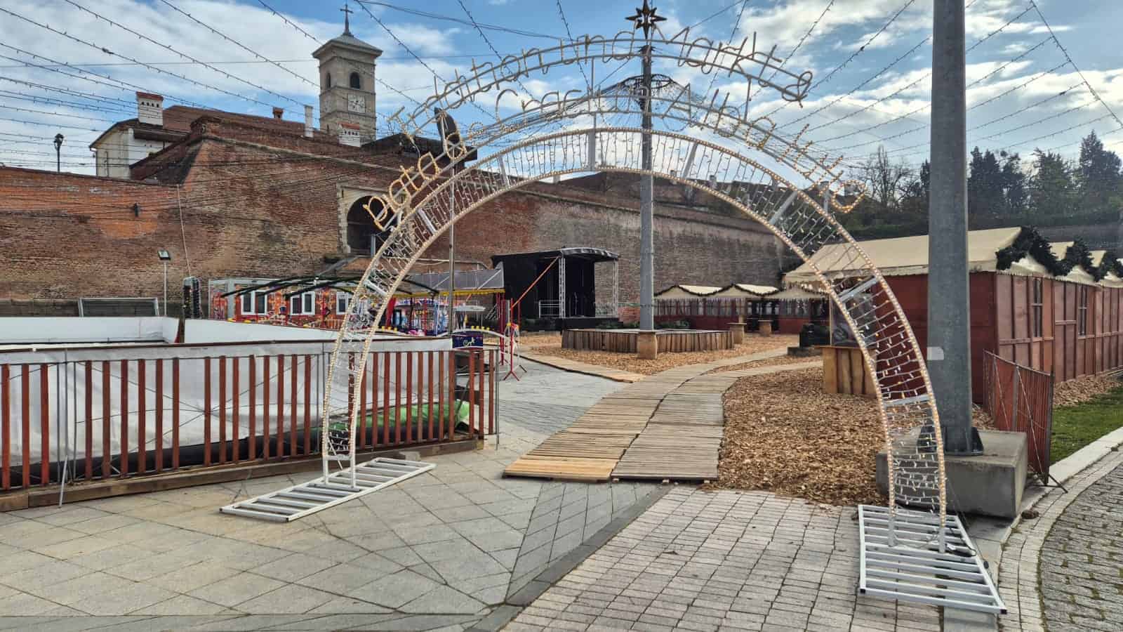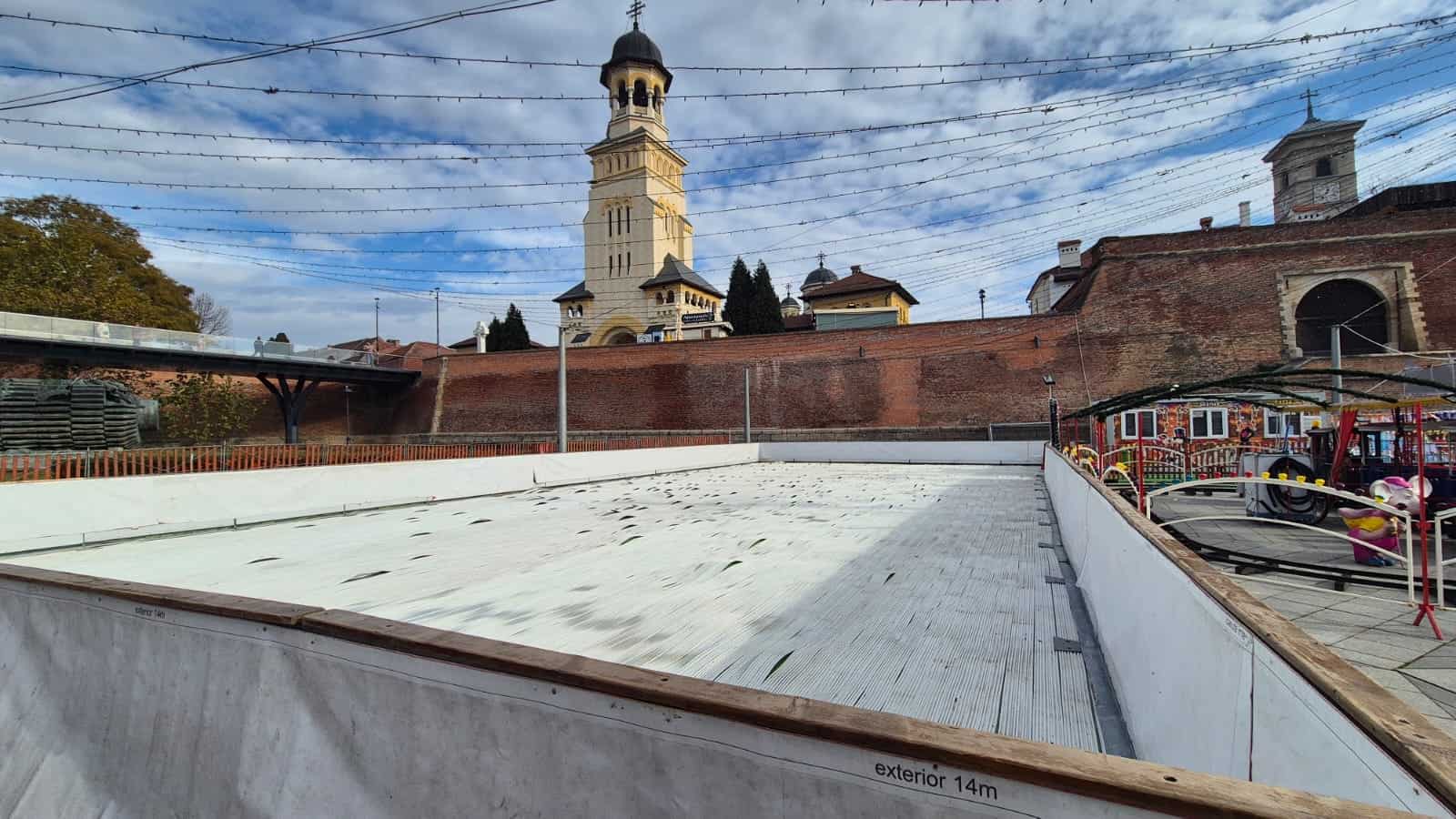 FOTO: Pregătiri pentru deschiderea Târgului de Crăciun la Alba Iulia. Au fost montate patinoarul, caruselul, scena și căsuțele
