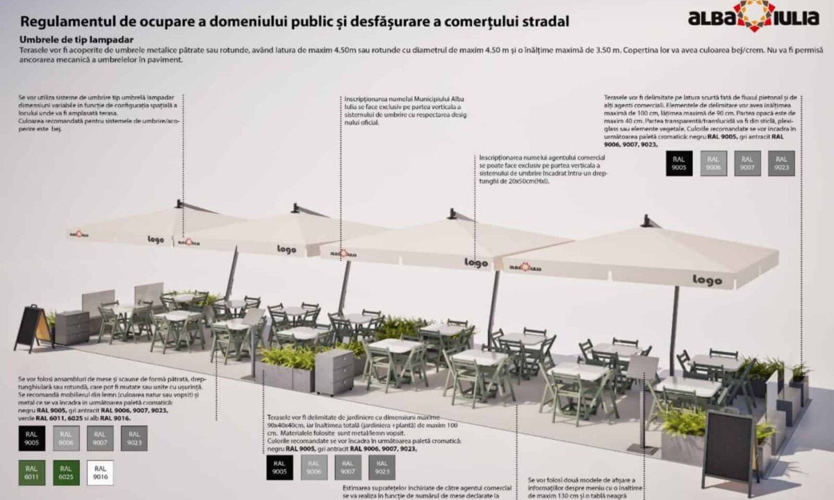 cm, conform anexelor la prezentul regulament. În situația în care umbrele sau copertinele sunt inscripționate și cu mesaje publicitare ale agentului economic care a amenajat terasa sau cu brand-ul firmei care a amplasat/furnizat umbrelele, deținătorul terasei va achita taxa de publicitate la Direcția Taxe și Impozite Locale; - Culorile umbrelelor sau copertinele vor fi din gama nonculorilor, griurilor nesaturate, pastelate (alb, crem, bej, gri), conform regulamentului.