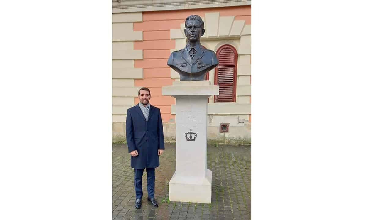 FOTO: Principele Nicolae al României, în vizită la Alba Iulia. Fotografie făcută lângă bustul Regelui Mihai, în fața Muzeului