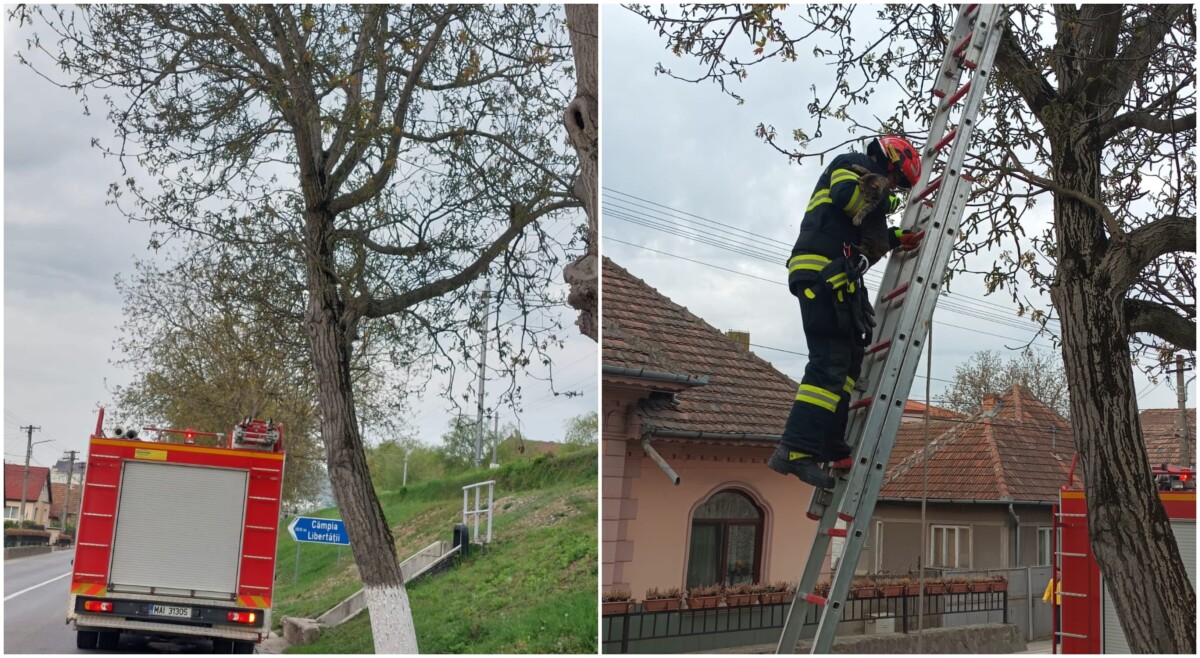 Pompierii din Blaj au salvat un pui de pisică care a rămas blocat de două zile într-un copac aflat pe strada Tudor Vladimirescu din municipiu.