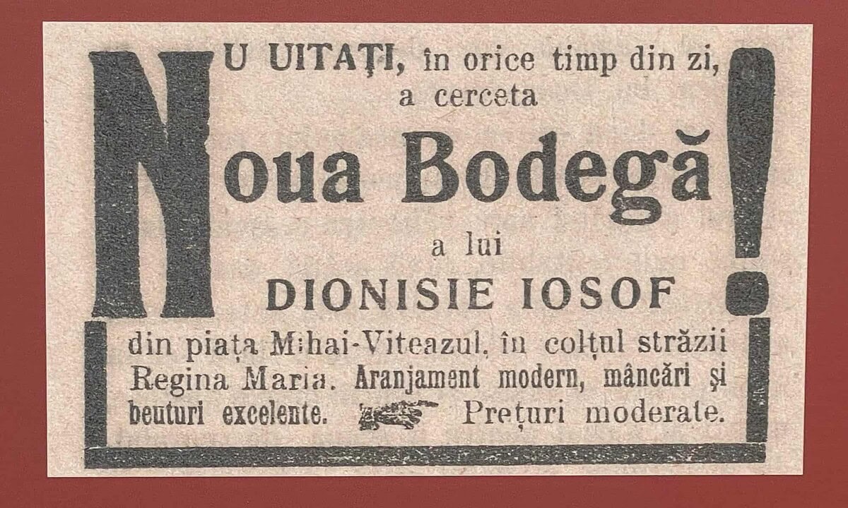 „Nu uitați în orice timp din zi a cerceta Noua Bodegă a lui Dionisie Iosof din piața Mihai-Viteazul, în colțul străzii Regina Maria. Aranjament modern, mâncări și beuturi excelente. Prețuri moderate”