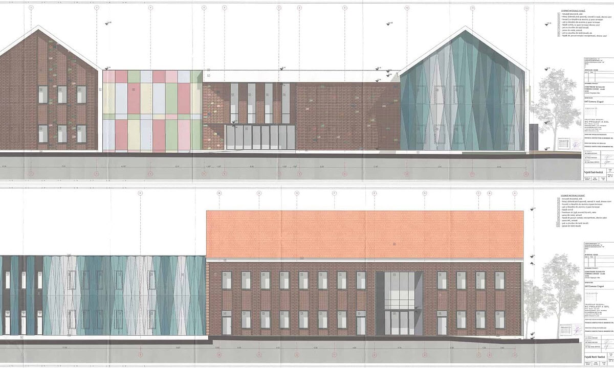 - Fațade: fațadele sunt finisate în diverse forme pe fețele exterioare respectiv pe fețele curții interioare cu tencuieli și zugrăveli obișnuite respectiv cu placări din cărămidă cu țesere specifică, fațade ventilate placate cu casete de tablă micro perforate, placări cu cărămidă pentru fațade ventilate cu sisteme de umbrire pasiv;
