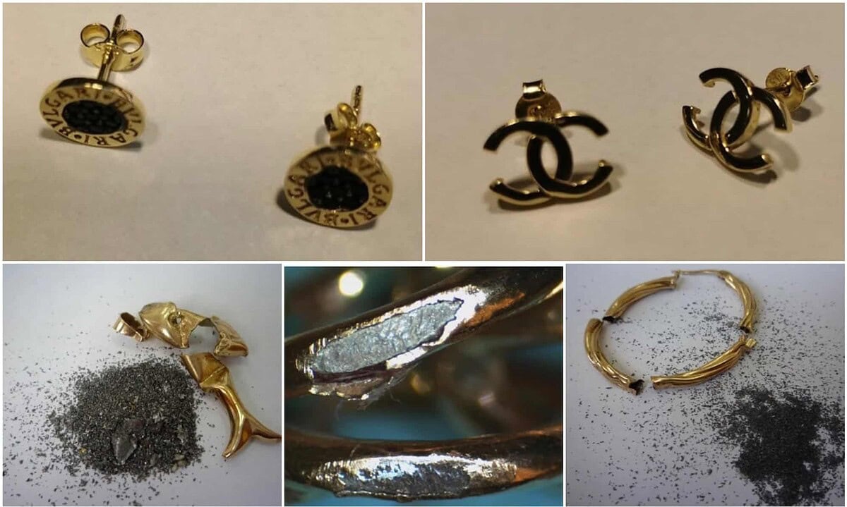 Copii după mărci celebre: Bulgari, Chanel, Louis Vuitton, bijuterii umplute cu pilitură de metal comun sau bijuterii cu interior de metal comun și exterior de aur”, a explicat Paul Anghel, într-o postare pe rețeaua de socializare Facebook.