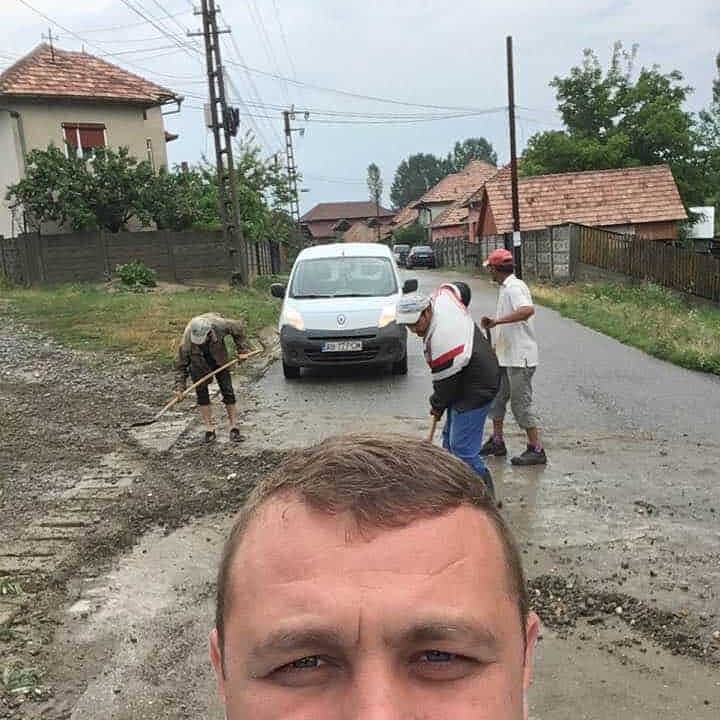 FOTO: Selfie după furtună! Primarul din Meteș, Dan Opruța, cu o mână-și face poze și cu cealaltă intervine la inundații