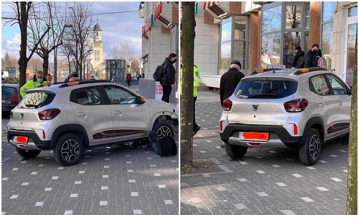 Un autoturism electric, marca Dacia Spring, a intrat pe trotuar și s-a izbit de scările are asigură accesul într-un magazin.