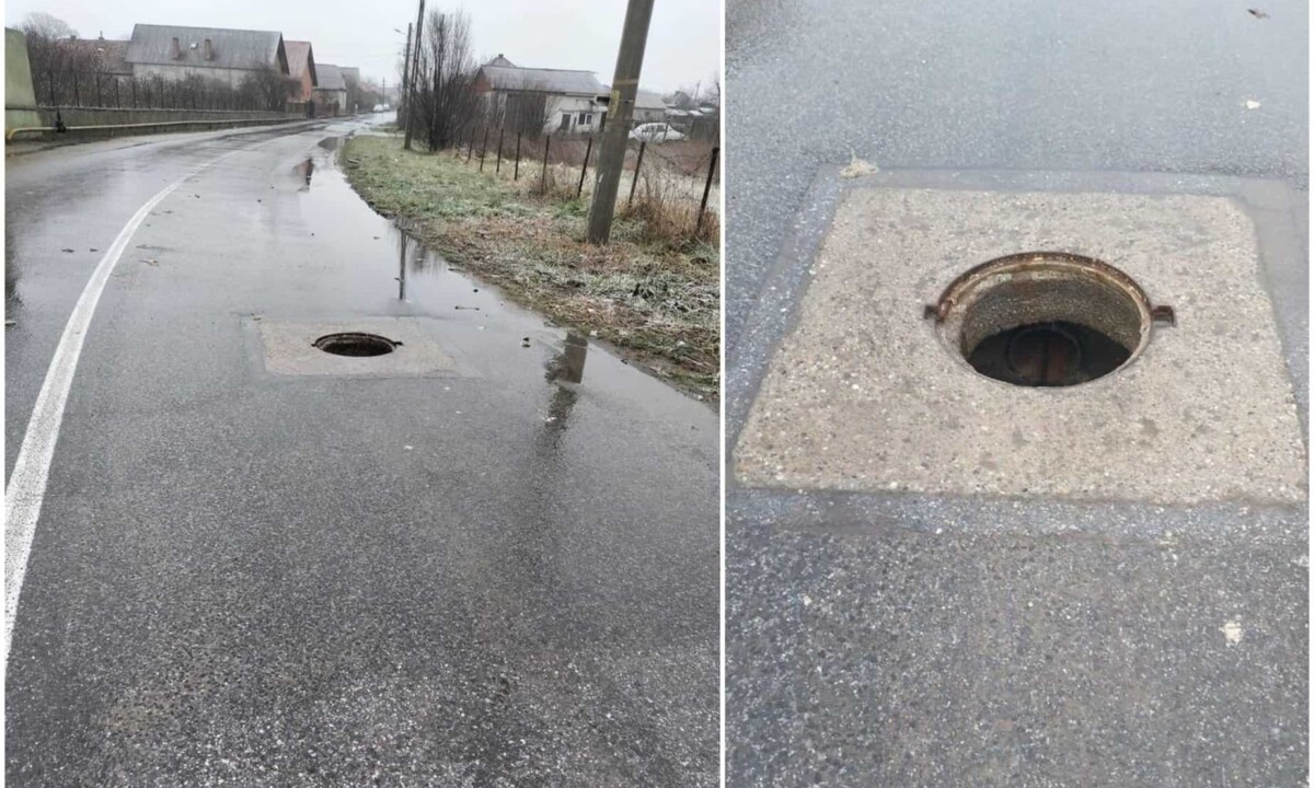 Capacul unui canal lipsește, lăsând pe supfața de rulare o groapă, mai bine zis o adevărată capcană pentru șoferi.