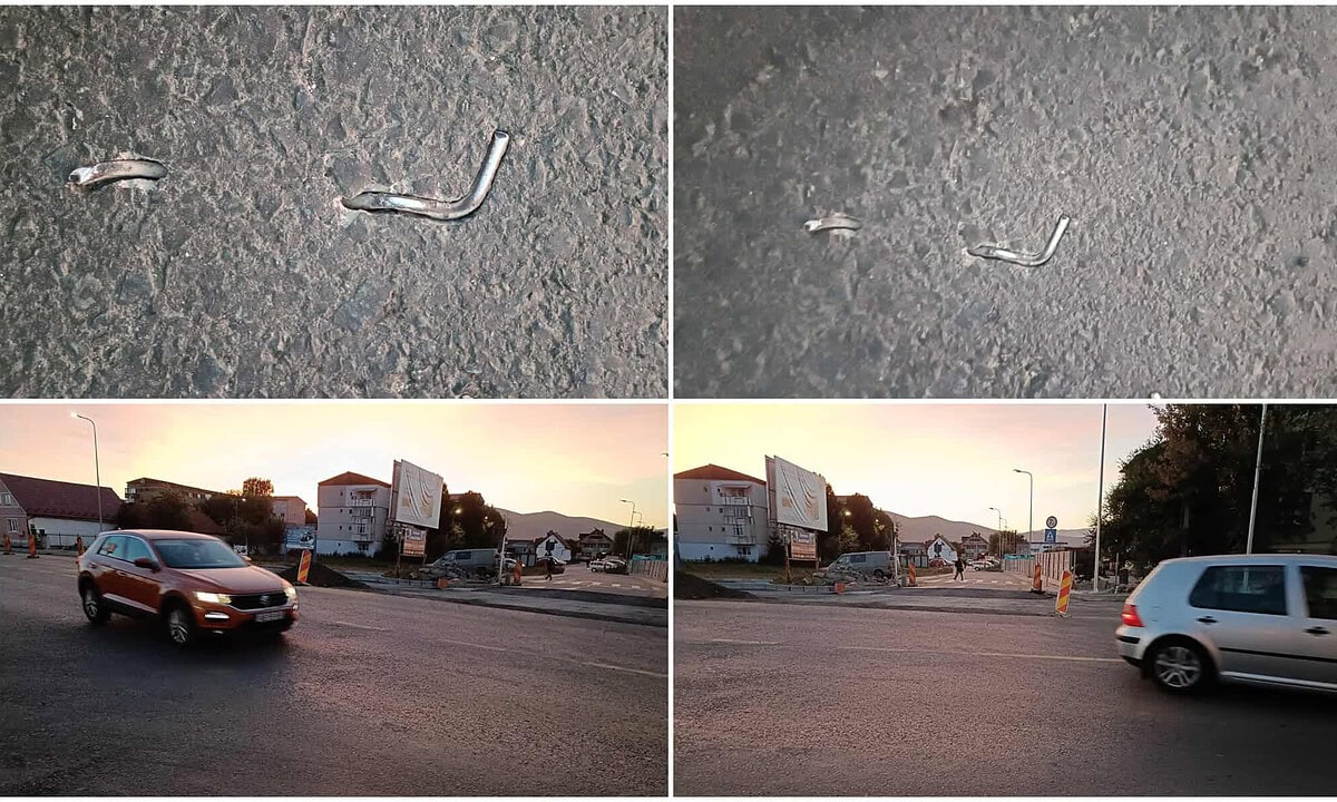FOTO ȘTIREA TA: „Capcană” pentru șoferi, pe o stradă din Alba Iulia. Bucată de fier, uitată de muncitori în asfalt